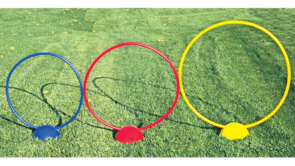 Use sand or water-fillable domes as markers, mini-game standards, and more! Use a target or obstacle by placing any 3/4 to 1-1/4 inch hoop in the horizontal slot. Or use as a marker or horizontal barrier by placing a wand or activity standard in the vertical hole. Constructed of ABS plastic, and new re-designed cap is now water or sand-fillable (12 lbs). Set includes six domes, one each in Red, Blue, Green, Yellow, Purple and Orange and measuring 10 inches in diameter and 5 inches high.Includes: