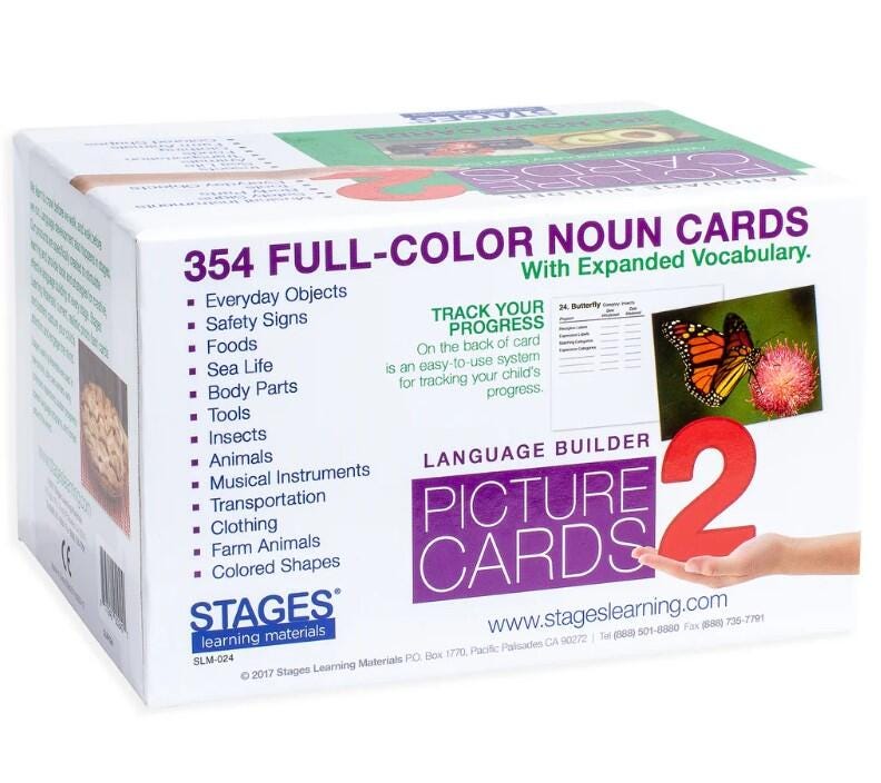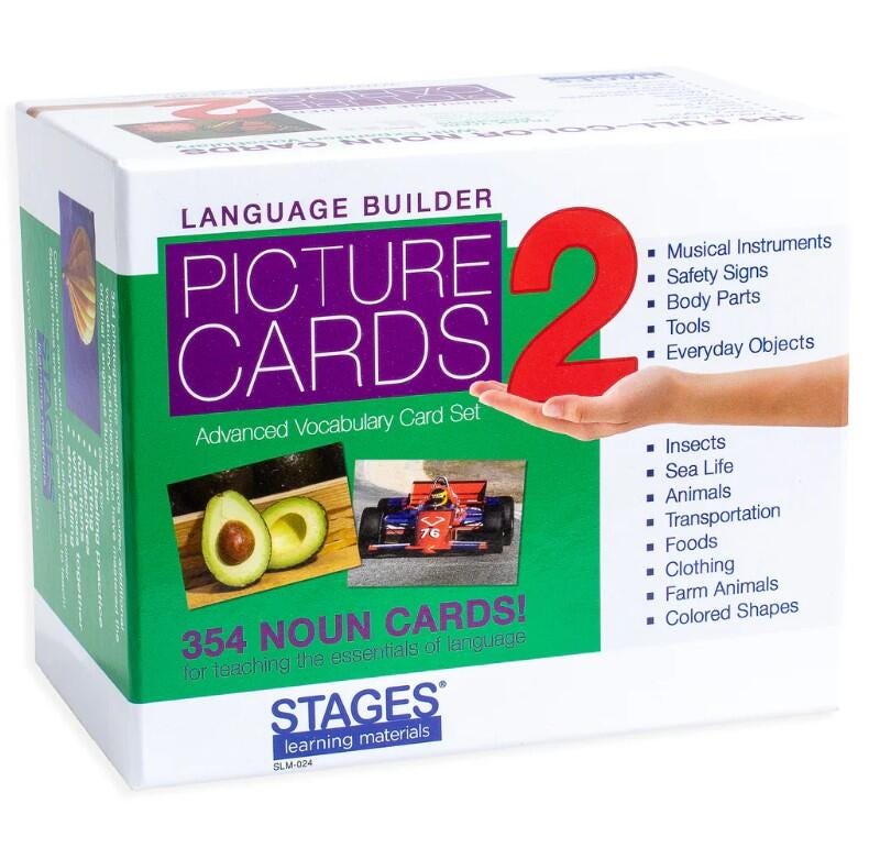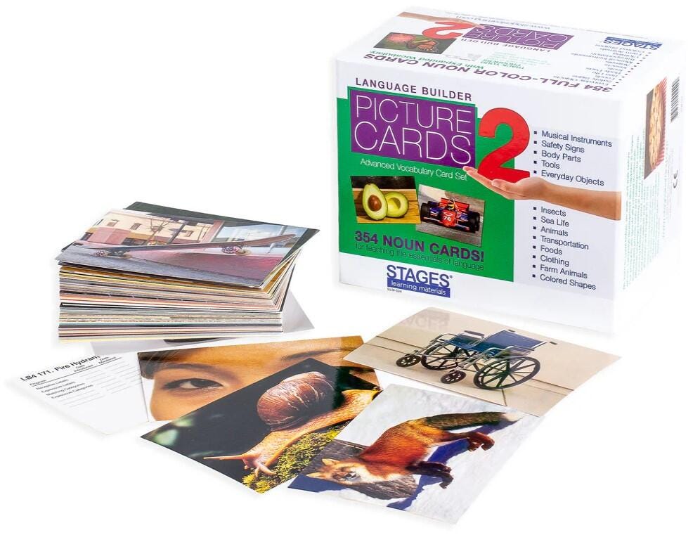 A fun, colorful, interactive way to practice labeling, sorting, grammar, matching, storytelling and more! Categories include body parts, safety signs, tools, musical instruments, animals, clothing, transportation, foods, and everyday objects. Includes 354 photographic cards, each measuring 3-1/2 x 5 inches.
