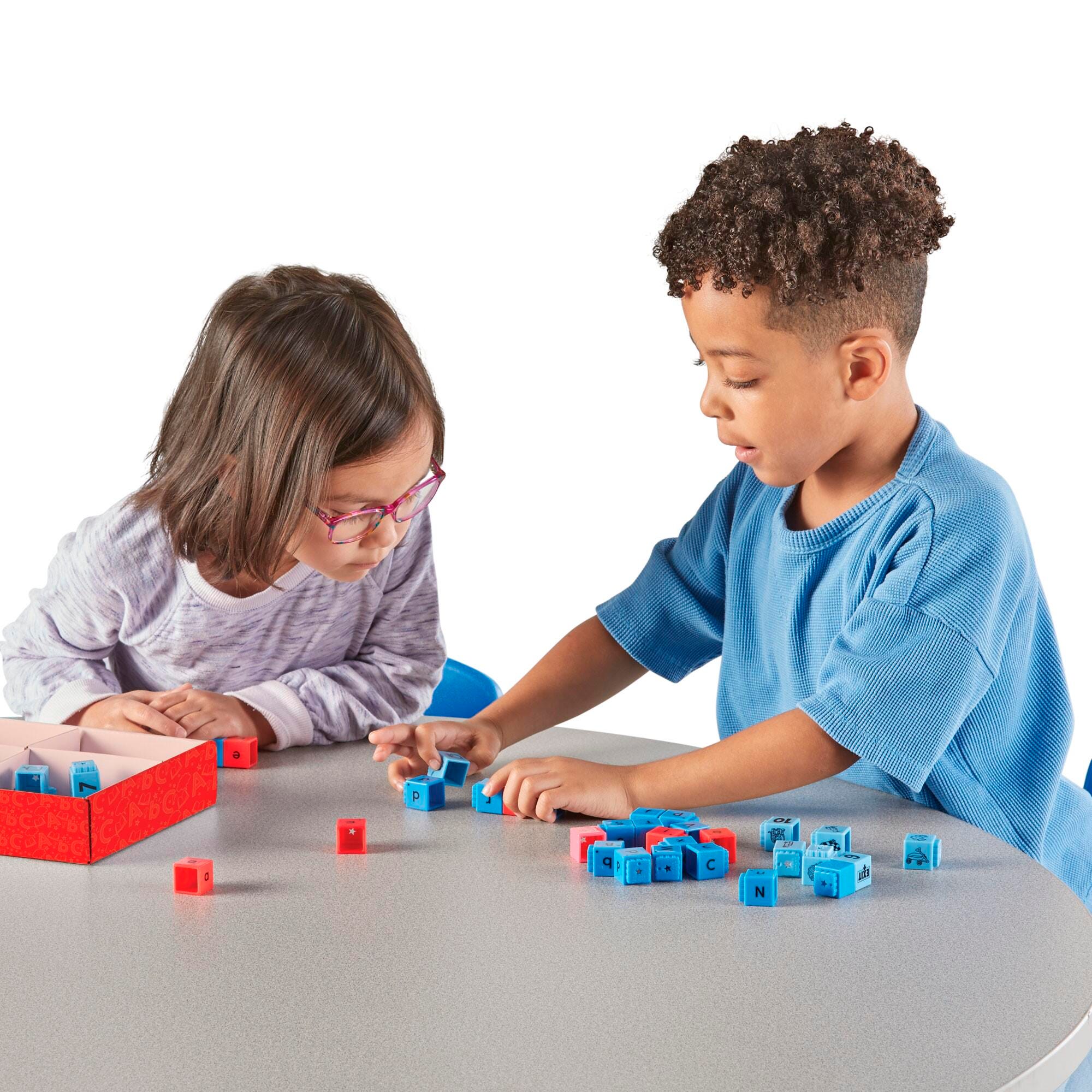 Linking letter cubes are a versatile tool for teachers and families to help build reading skills. Use these during whole group time to demonstrate the word of the day, or the daily message. Blue cubes represent consonants and the red cubes represent vowels. There are 2 of each letter so you can build words. Each picture on the light blue cubes starts with a consonant, and the pink picture cubes all have pictures of things that start with a vowel. Each picture cube is 4 sided and each picture starts with the same letter. All letter cubes have 2 capital letters and 2 lowercase letters.Features