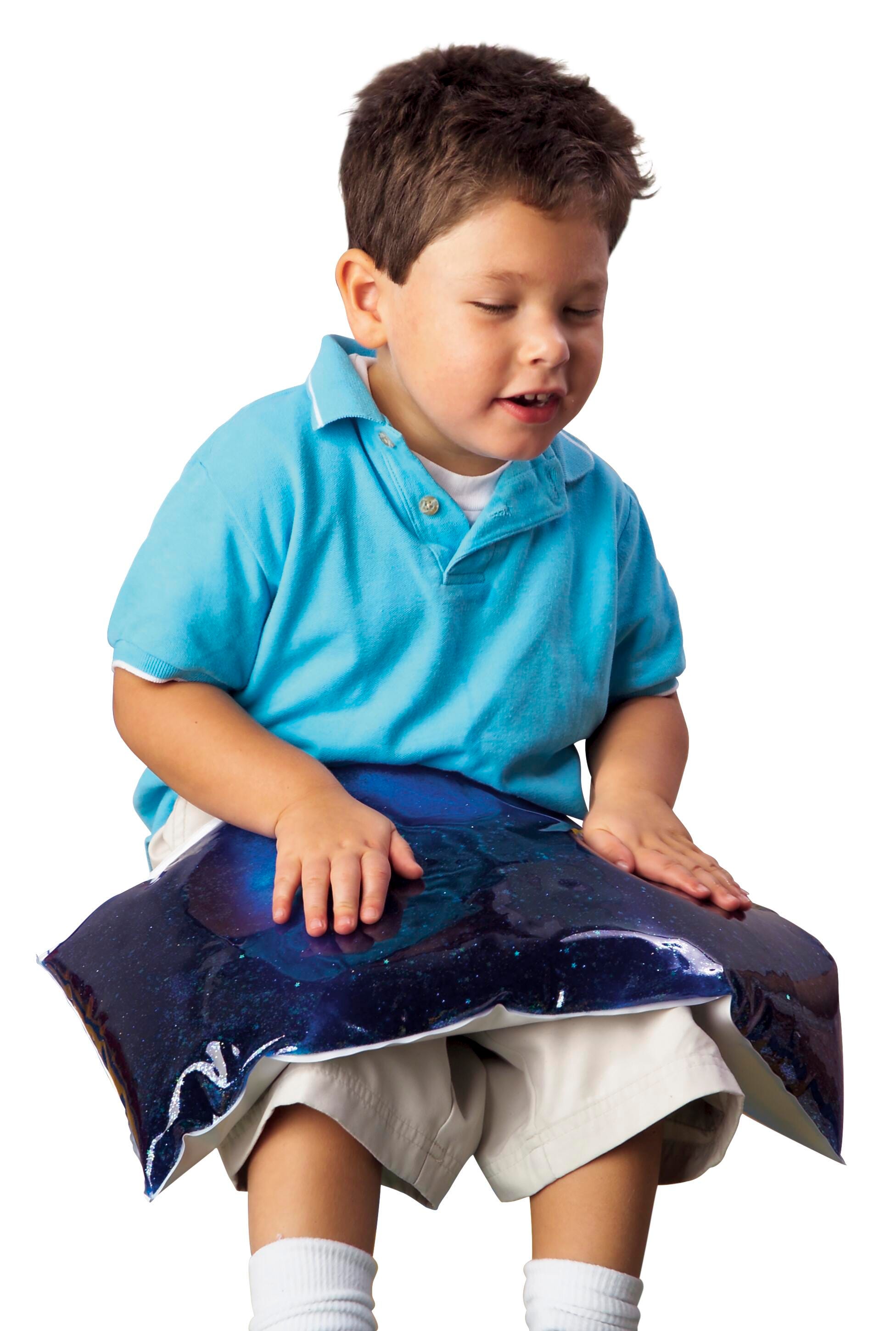 Provide a unique multi-sensory experience with this gel weighted lap pad. See the glitter, feel the movement of the gel under your fingers, and sense the weight of the pad which provides deep pressure for a secure, grounded feeling. Enables users to stay seated for a longer period of time. For use in chairs, in class and during road trips. Vinyl covered 10 x 22 inch, 7 pound pad wipes cleanIncludes: