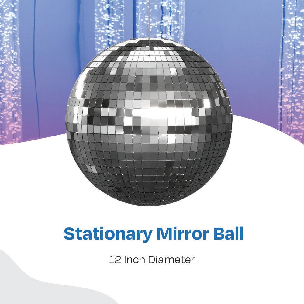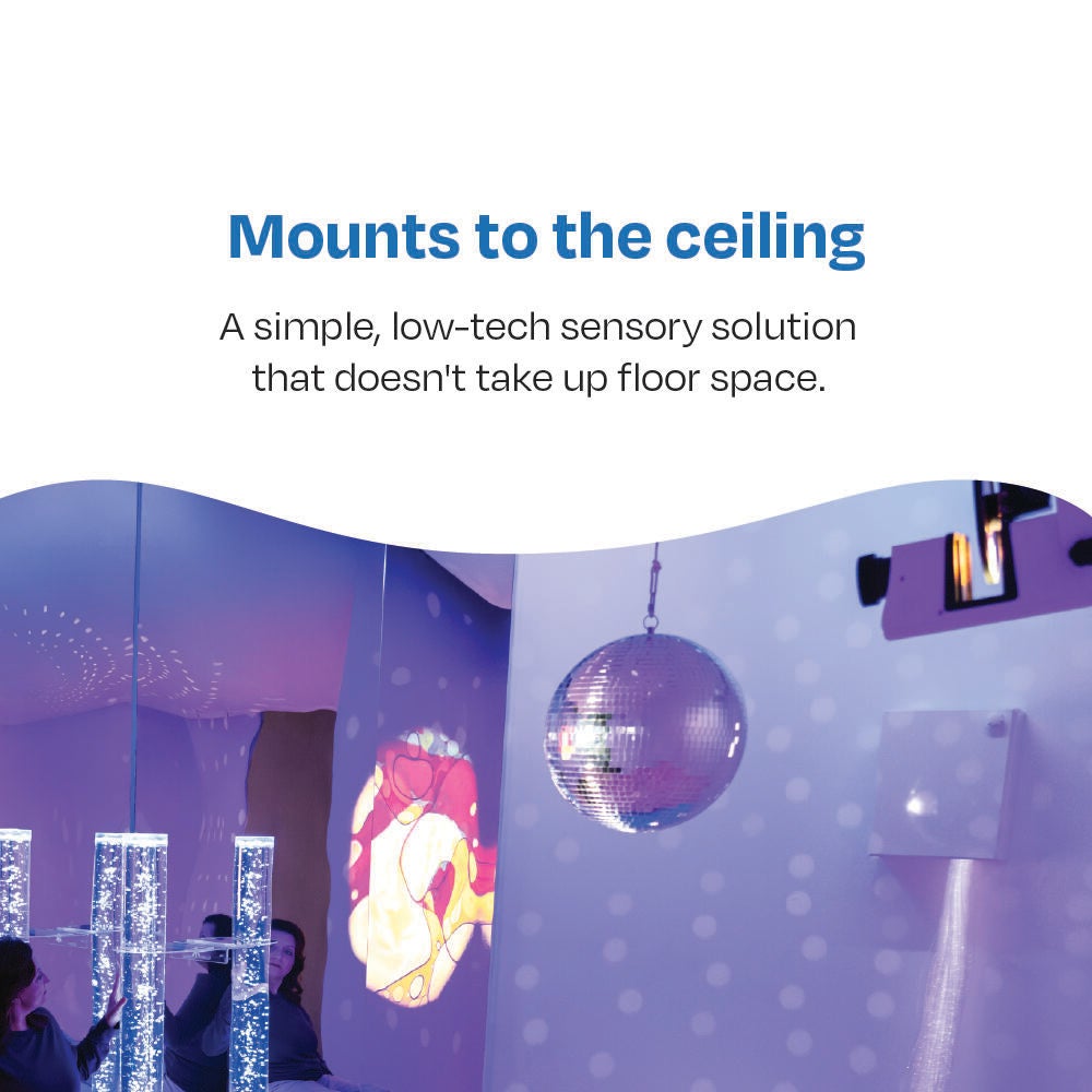 Classic disco ball experience without the moving, spinning lights. This stationary mirror ball projects mirrored light throughout the room for a fun light experience, and is designed to be hung from the ceiling. Includes "S" hook for mounting, meaning this fixed mirror ball can be put up and taken down in minutes. Measures 12 inches. Can add an optional rotating motor, however this will no longer be accessible to those prone to seizures or motor sickness should the motor be added.