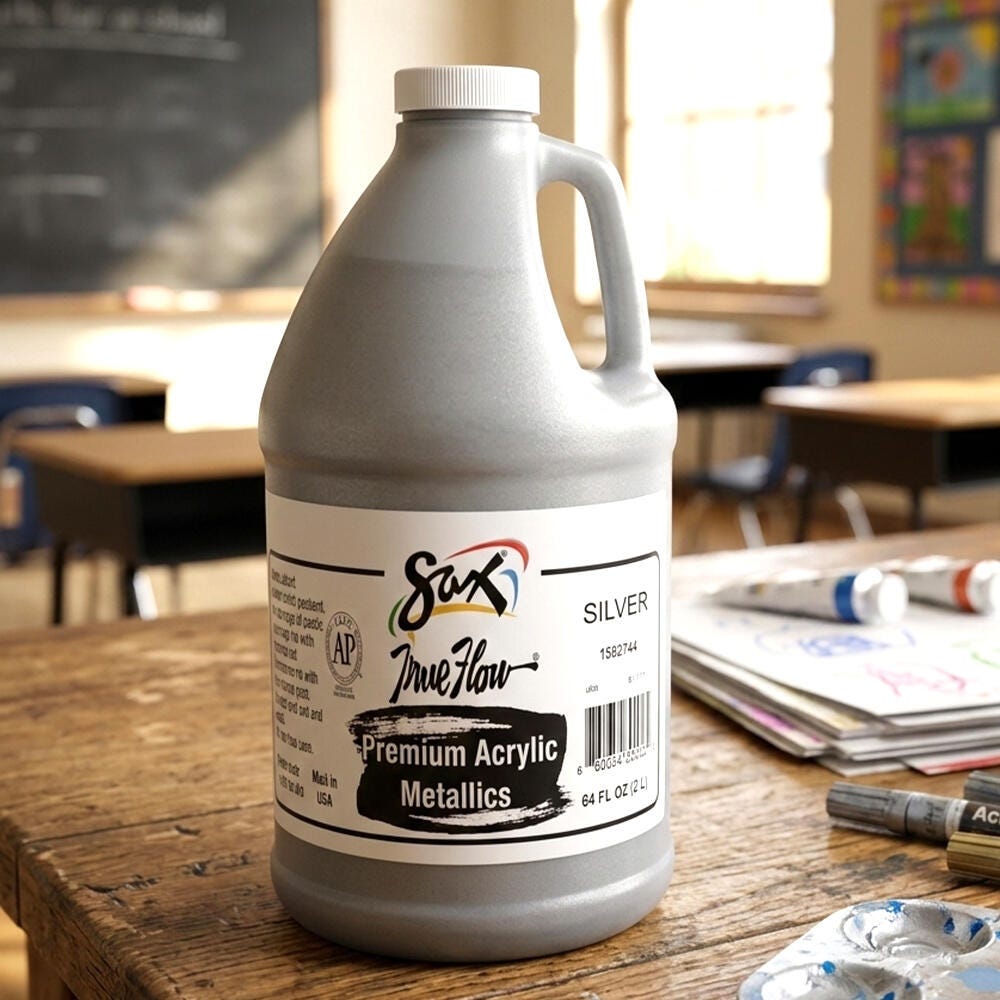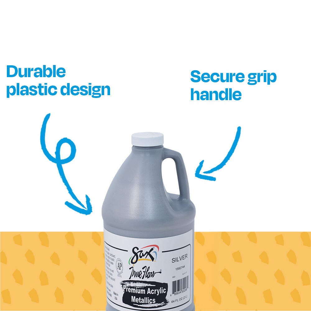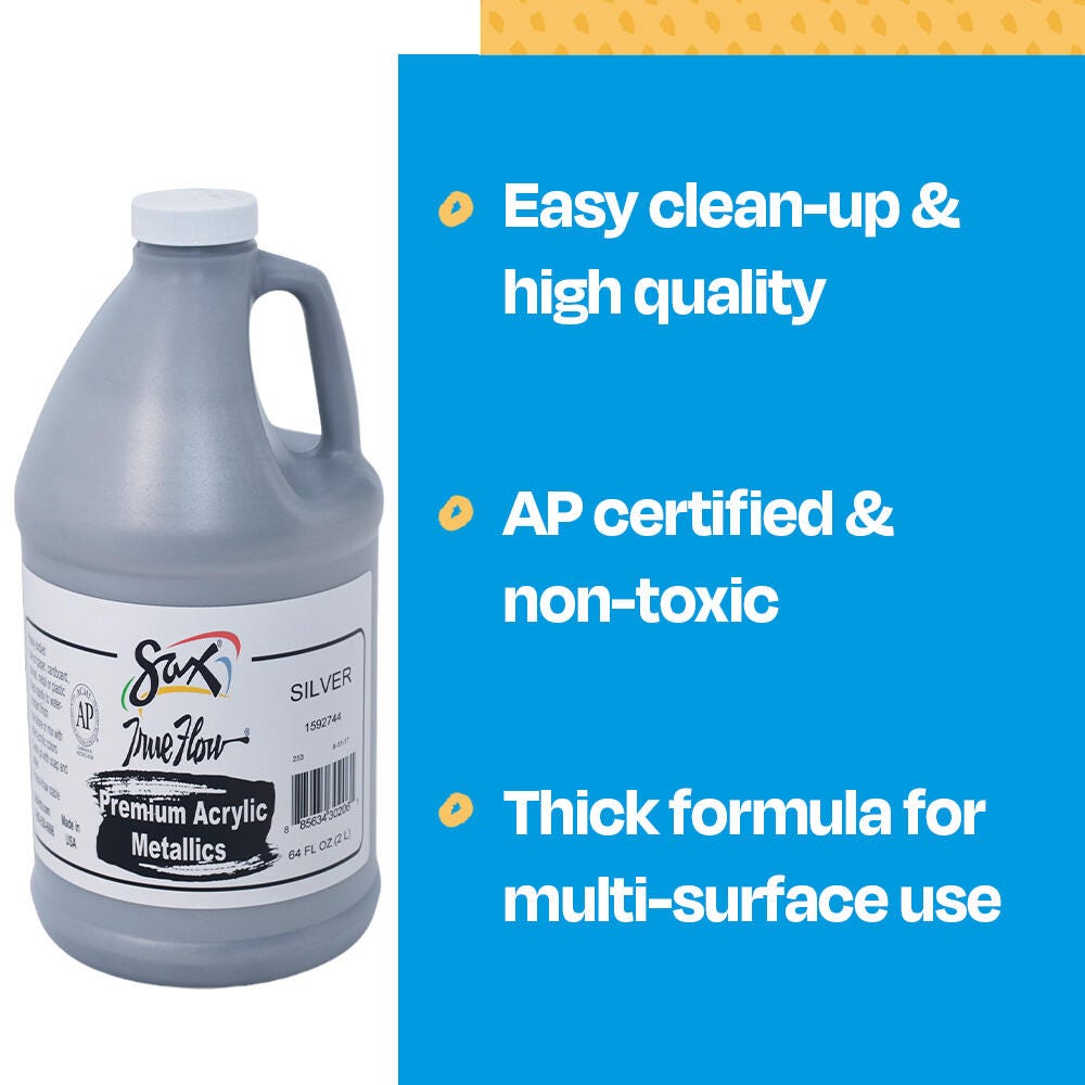 Sax premium heavy-bodied acrylic paint in metallic silver is perfect for completing unique art projects. Craft paintings, posters, signs, and backdrops with the large half gallon bottle for classrooms and studios. Our painting medium provides superb coverage and dries to a matte finish. Use it alone or mix with other acrylic colors to create beautiful shades. The big container makes it easy to use, share, and store.