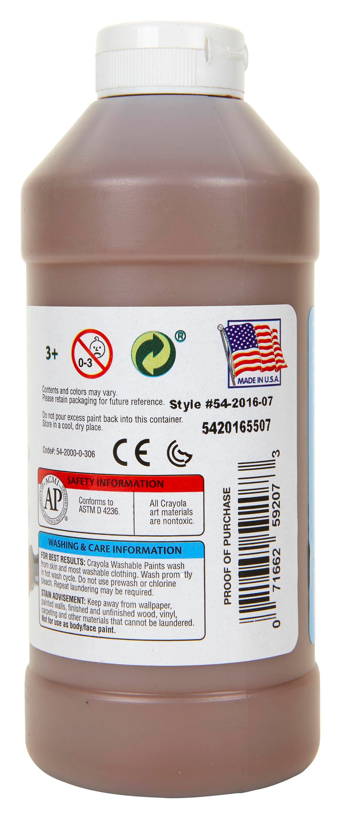 Enhance any artwork with high-quality and vibrant Crayola Washable Paint! The paint's thick, creamy consistency provides rich color and an opaque covering on most surfaces. Plus, this child-friendly paint is easily washed from skin and almost all clothing. This deep brown paint comes in a 1 pint bottle with a screw lid so it is easy to pour—great for projects in the classroom, childcare center, or home.