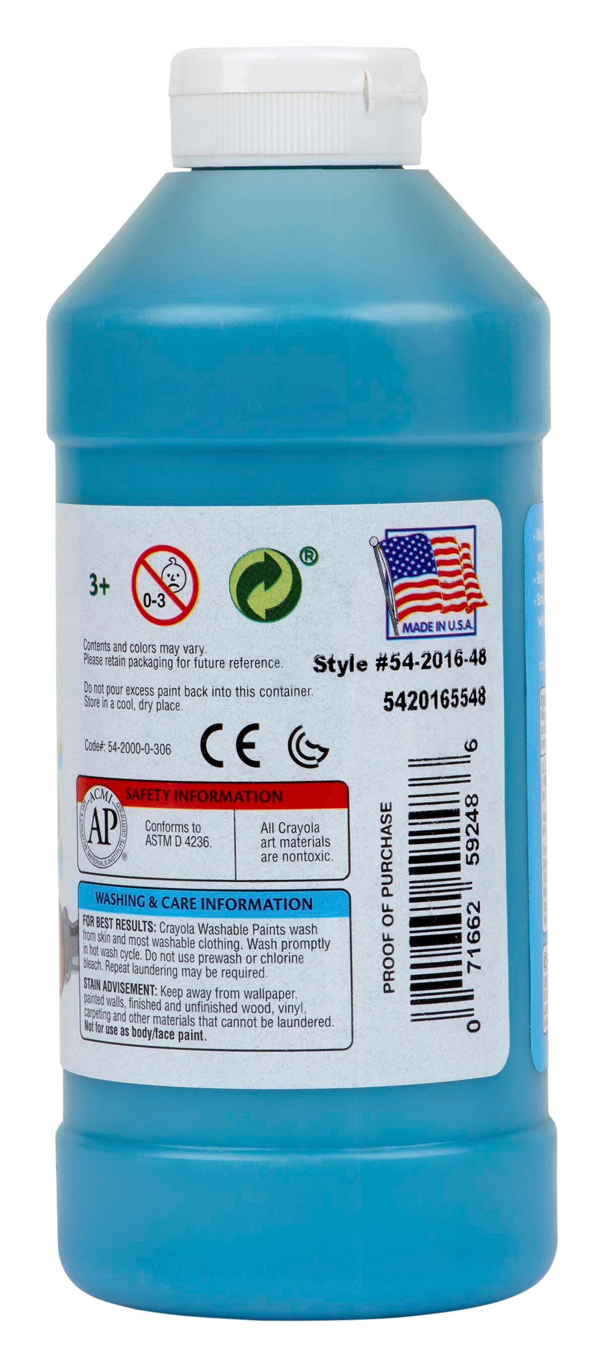 Enhance any artwork with high-quality and vibrant Crayola Washable Paint! The paint's thick, creamy consistency provides rich color and an opaque covering on most surfaces. Plus, this child-friendly paint is easily washed from skin and almost all clothing. This bold turquoise paint comes in a 1 pint bottle with a screw lid so it is easy to pour—great for projects in the classroom, childcare center, or home.
