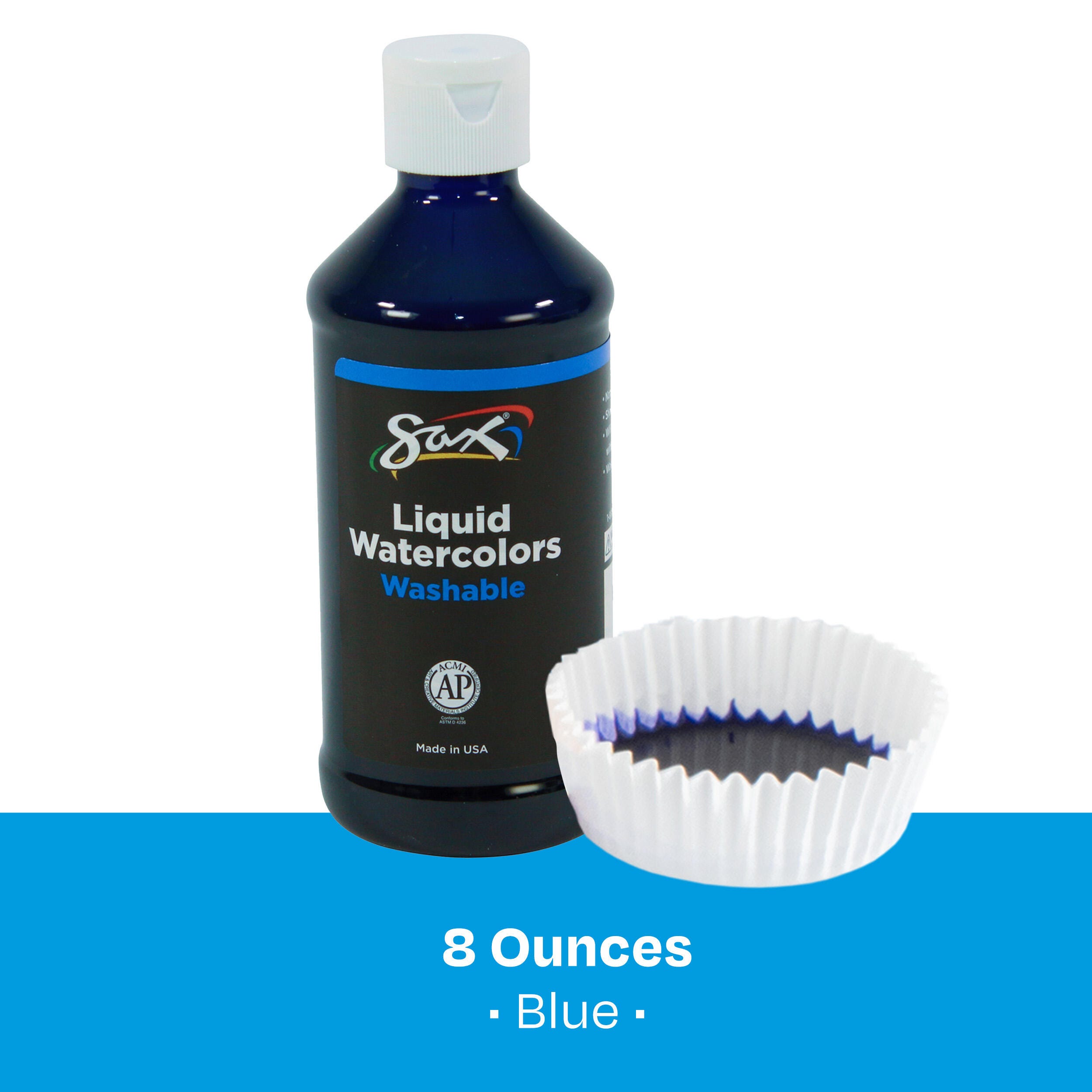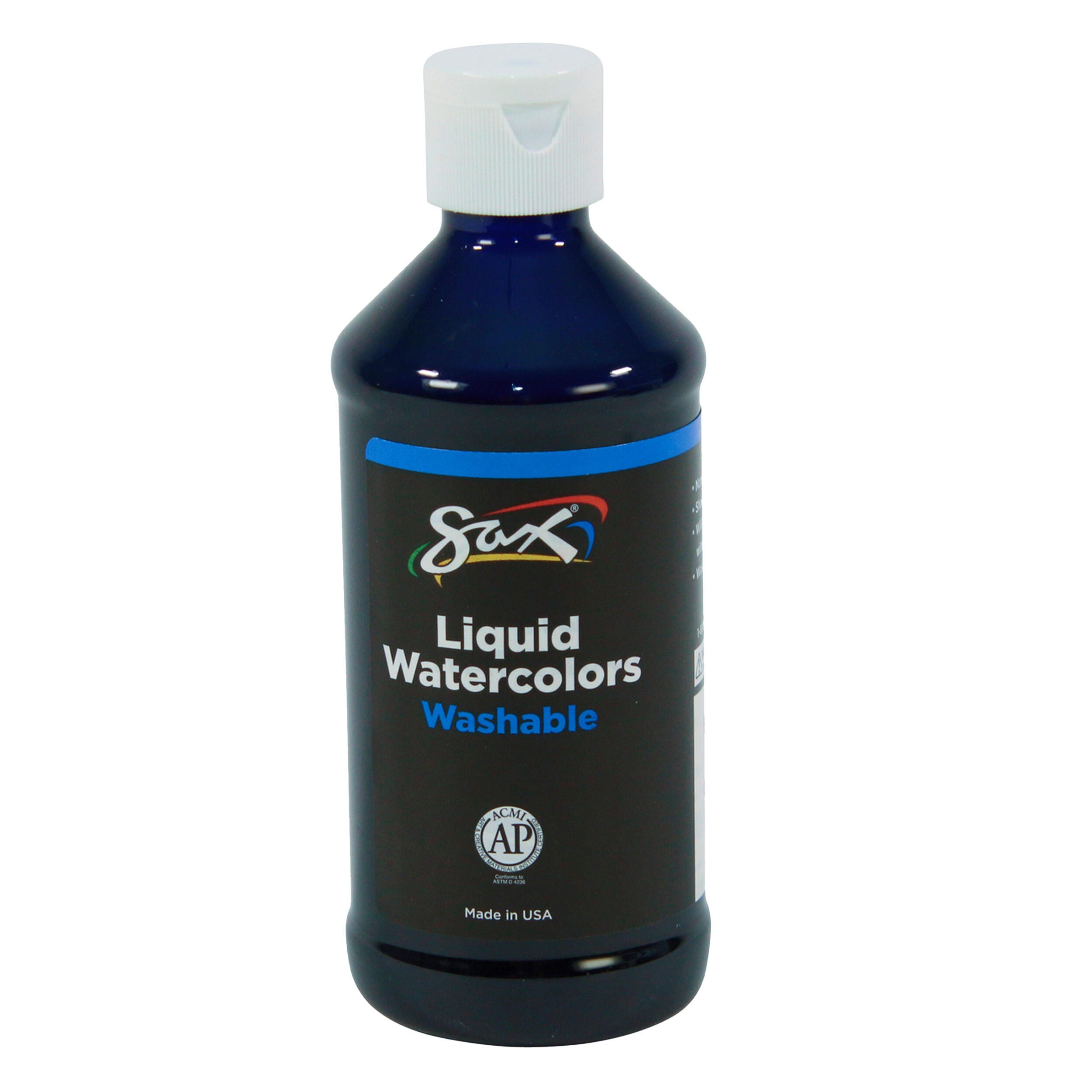 This Sax liquid washable watercolor paint comes in a blue color. The liquid medium provides rich hues straight from the bottle with beautiful results when dried on paper or other materials. A thicker viscosity allows for better control and easier dispensing, along with increased surface tension for less color bleeding. Use this paint at full strength (undiluted) or dilute as needed with water for soft, muted colors. The formula is washable, easy to clean from hands with soap and water, and rinses out of most fabrics. Enjoy easy pouring with a plastic jug that can be poured from the big-mouth opening or dispensed slowly from the snap-down pour spout. Shake well before use.