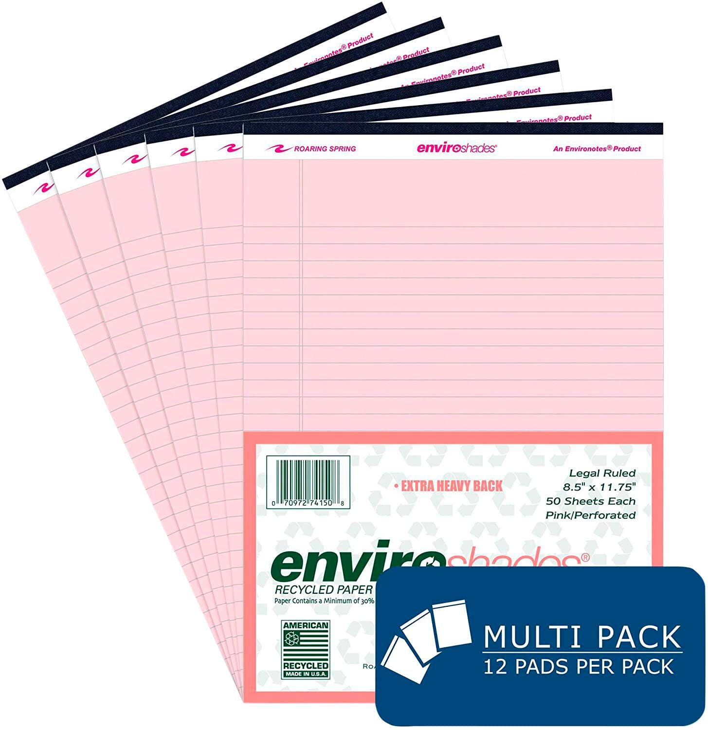 The Enviroshades Legal Pad measuring 8-1/2 x 11-3/4 inches features a vibrant pink paper manufactured with at least 30% post-consumer waste. Each sheet offers a smooth, legal-ruled, writing surface with double margins and micro-perforation for easy removal. The pads are securely taped and staple-bound. This pack contains 12 pads, each containing 50 sheets.Features