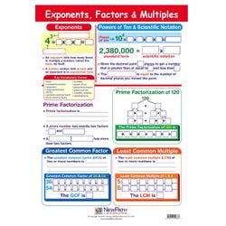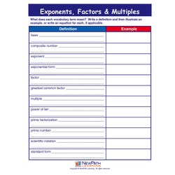 Complete, easy-to-use and engaging, the Exponents, Factors & Multiples Learning Center is ideal for the instruction and review of this key, standards-based concept. Designed for either teacher-directed instruction or independent use by groups of 2 to 4 students, the Learning Center provides complete, leveled coverage of this curriculum-aligned topic, making it perfect for differentiated instruction. To use, the students first work individually or in pairs using the 4 laminated Visual Learning Guides provided on the topic. The guide provides a graphic, easy-to-follow overview of the concept; “Write-On/Wipe-Off” activities and graphic organizers; and a set of guiding, assessment review questions. They then form in a group to play the Curriculum Mastery Game included for cooperative or competitive review and reinforcement of the concepts. Packaged in a durable pouch, the Learning Center is a ready-to-use resource for the classroom, after school and summer school programs or at home for test preparation, practice and review! Grades 6 to 9.Features