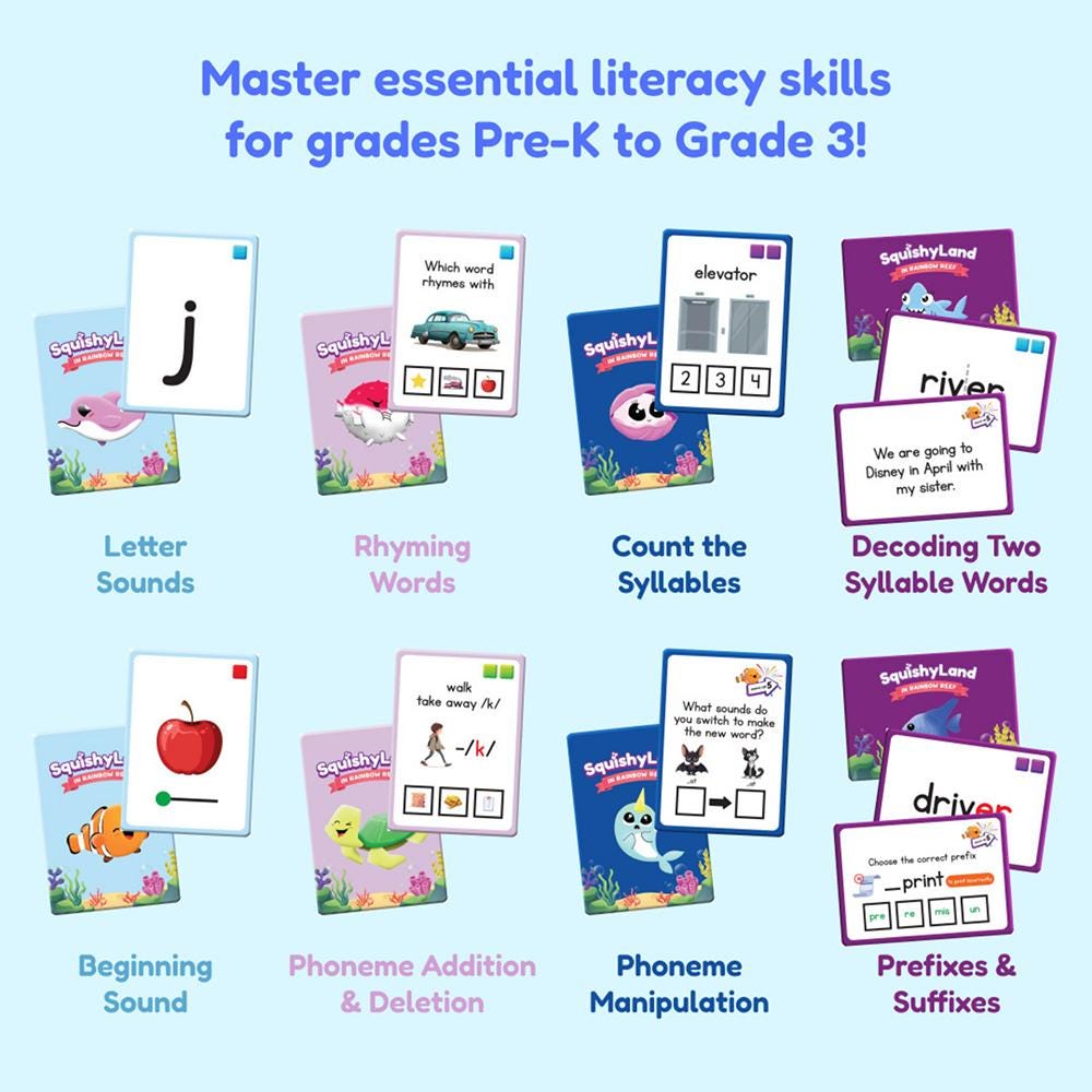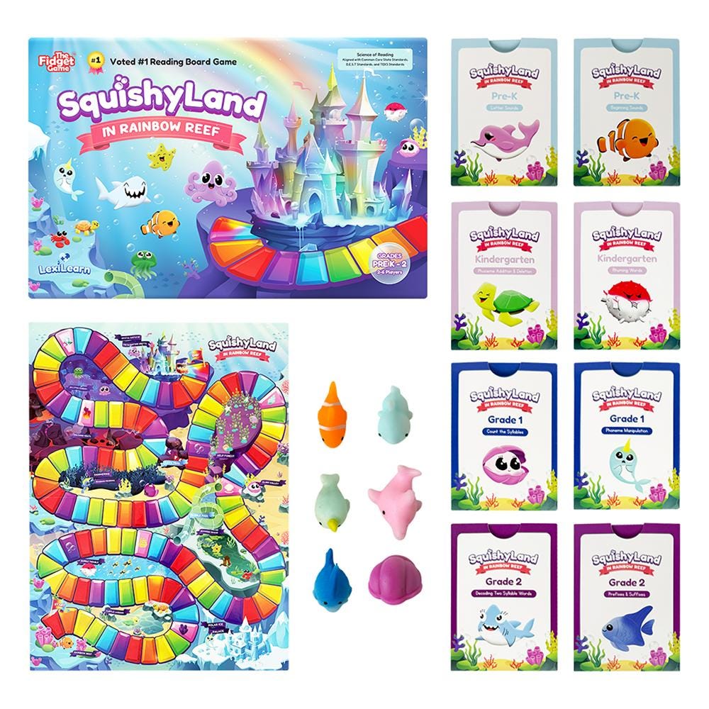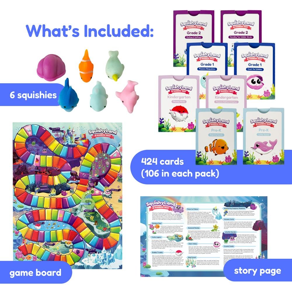 SquishyLand from The Fidget Game is a hands-on, interactive learning game that helps children master the foundational reading skills they need for long-term success. With visual supports, tactile tools, and engaging gameplay, SquishyLand is designed to grow with your child from Pre-K through 2nd grade. Each level targets specific phonological awareness and phonics skills aligned with grade-level standards, making it perfect for small group instruction, centers, or at-home practice. This includes beginning sounds and letter sounds for Pre-K students, phoneme addition /deletion and rhyming words for Kindergarteners, syllable counting and phoneme manipulation for 1st graders, while 2nd graders can master prefixes/suffixes and decode two-syllable words.Features