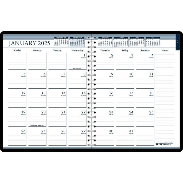 House of Doolittle offers high-quality planning solutions to help you stay on top of your busy schedule! This planner features an embossed faux-leather cover for a professional look and planning pages that cover 12 months, from January to December. Two-page-per-week spreads include ruled daily columns that have half-hourly appointment times from 8 AM to 9 PM, and Monday-through-Sunday scheduling. They also provide helpful information for comprehensive planning, including Julian dates and days remaining, a ruled notes section, monthly indicator tabs, and past, current, and two future months' reference calendars. The non-refillable planner also features paper made with 100% post-consumer recycled materials.Features