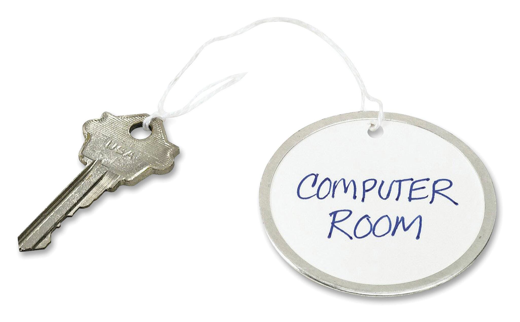 Avery White 2-1/4 Diameter Metal Rim Tag strung with cord is made of white cardstock with a rim of durable metal and features non-tarnishing metal edges that well protects the tag from bending, twisting or tearing. Cardstock gives a smooth and a clean surface for writing. Attaching the tag to the item and removing the tag from the item is made simpler with knotted white string. It is best suited for situations where they are used frequently or roughly. It is sold as 500 per pack.