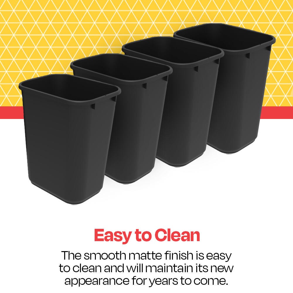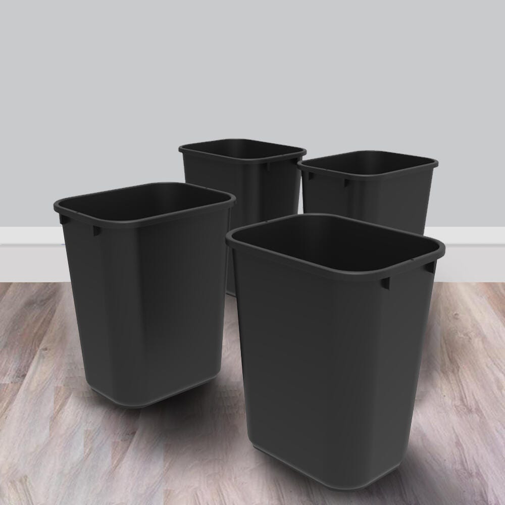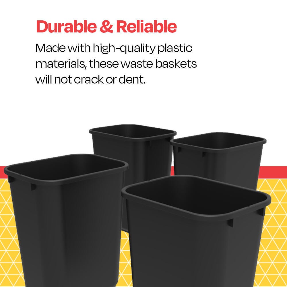 These 40-quart Indoor Waste Baskets are perfectly sized to store under a table, a desk, or in a cabinet for discrete and space-saving waste disposal. The small size is excellent for offices, bathrooms, bedrooms, dorm rooms, and other places where space may be limited. Their durable plastic construction will not crack or dent when accidentally dropped or knocked. This case contains 6 black indoor waste baskets.