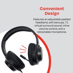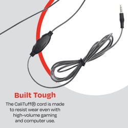 Califone G200T Over-Ear Gaming Headset features extra bass, inline volume control, and a flexible microphone. Gaming headphones don't have to be bulky or uncomfortable. Our adjustable headband has thick padding for added comfort, even with hours of use. The over-ear headset with mic boasts a unidirectional microphone on a flexible gooseneck that retracts into the earcup housing when not in use. Bend the speaker as needed during chats or flip up when only listening. Made for all ages, the highly durable CaliTuff cord is made of braided, PVC-jacketed material with a reinforced earcup entry point. It resists bending, cutting, and separation due to heavy use, chewing, or rough play. The long 6-foot cord has a 3.5mm plug for compatibility with Chromebooks, laptops, desktops, PCs, Windows, and Macs. These gaming earphones are backed by a 3-year warranty.Features