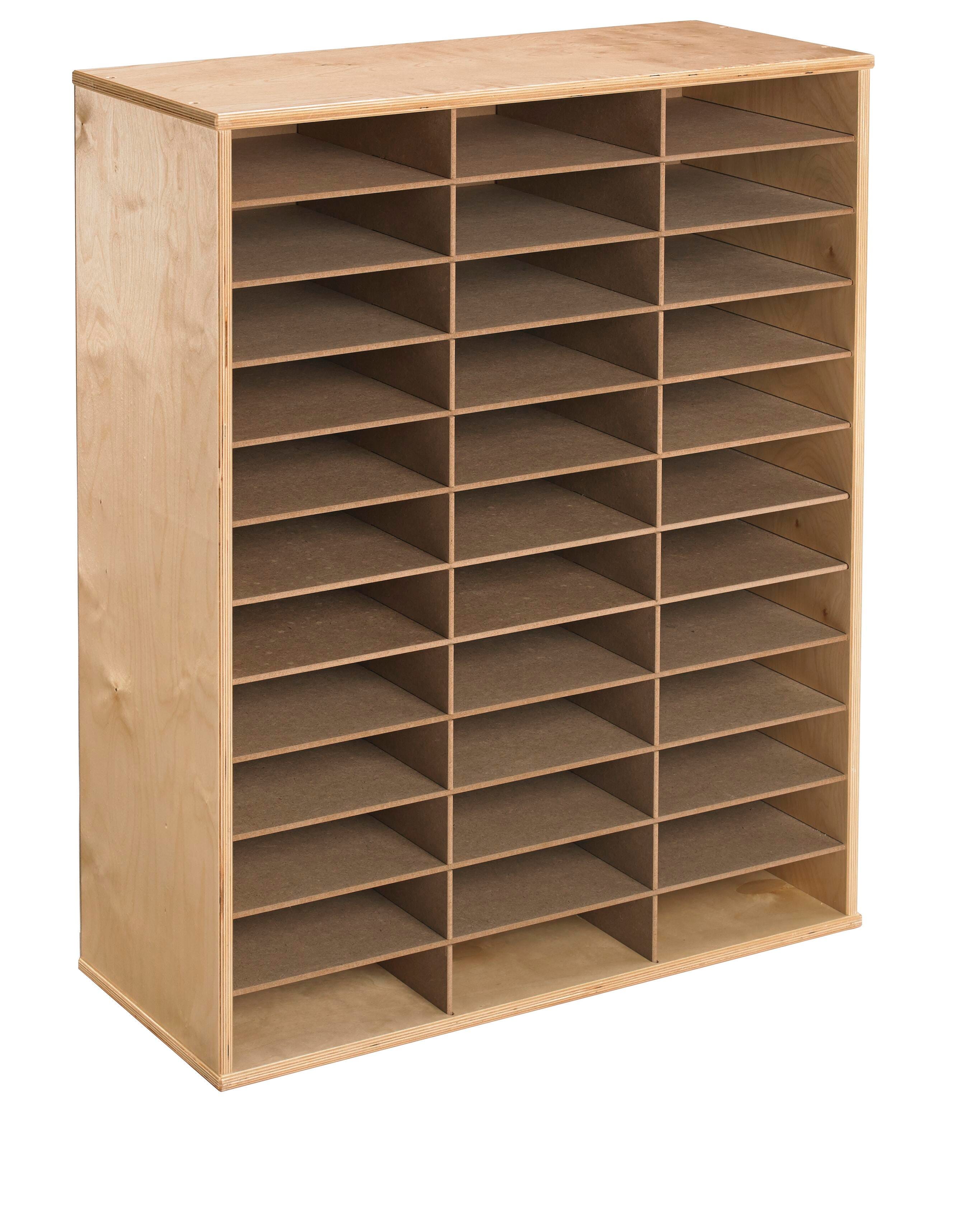 This storage organizer features 36 horizontal slots that offer ample space for storing mail, notes, messages, and more. Constructed of solid all-birch plywood on the exterior and sturdy corrugated cardboard shelves on the inside. Full unit measures 29 W x 12 D x 35-1/2 H inches. Assembly required. Hardware and instructions included. Colored paper in cubbies sold separately.Quickship subject to item component availability.Features
