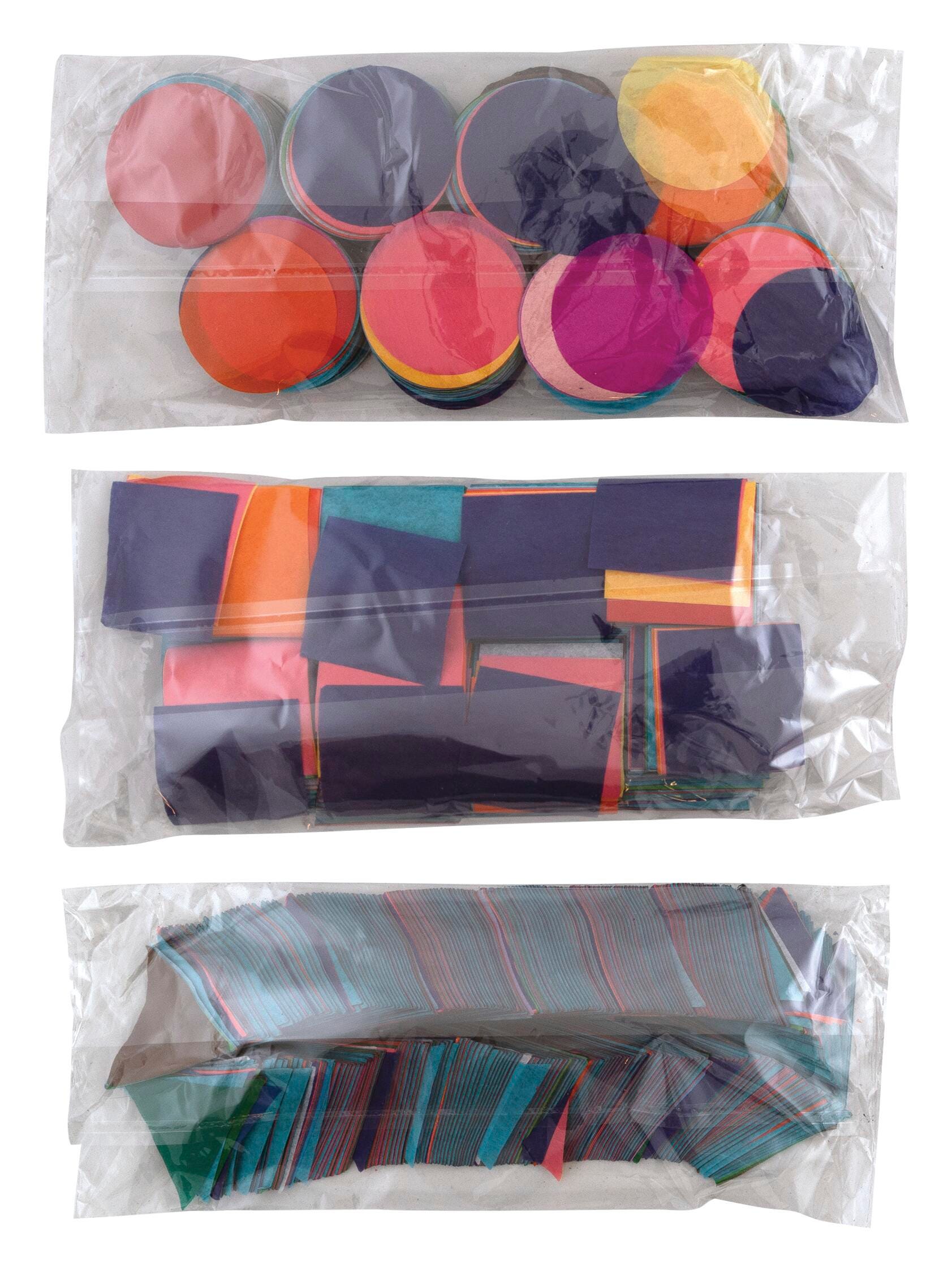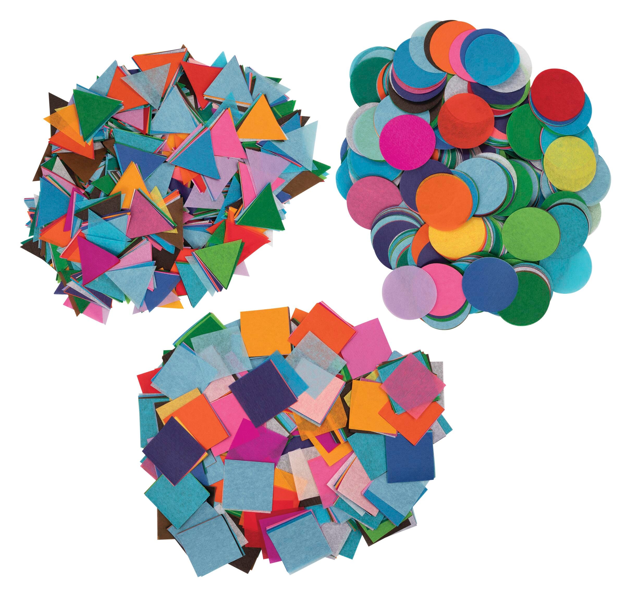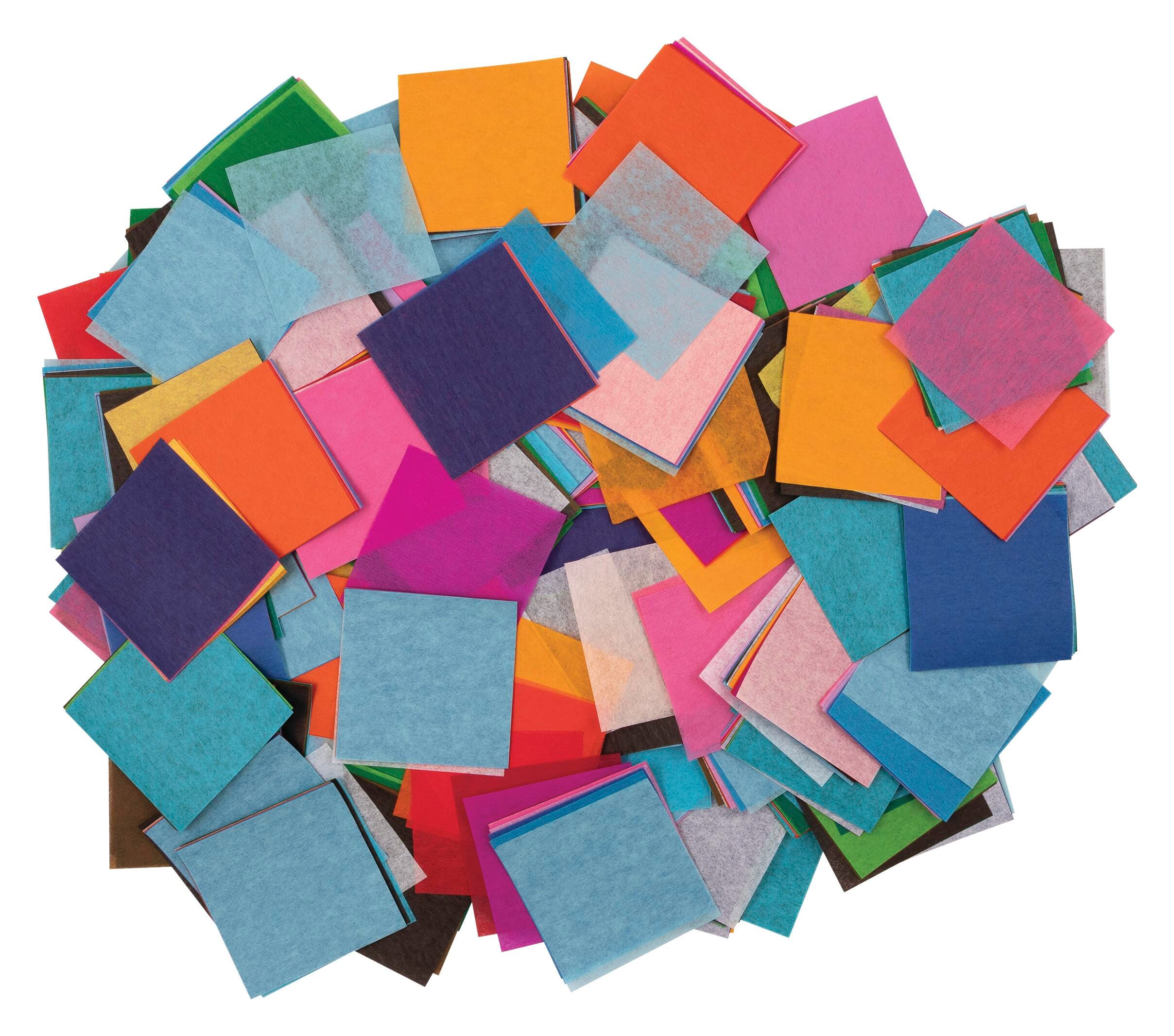 You can paint with Spectra Deluxe Bleeding Art Tissue! Wet with a brush and wash beautiful, translucent color onto the paper. Overlap two colors and watch them blend. Or, add glue to the water to hold specific shapes in place and create magnificent, multi-layered effects. The Bleeding Tissue Shapes Assortment is available in 25 assorted colors, including Cerise, National Blue, Chinese Red, Blush Pink, French Blue, Spring Green, Dark Pink, Scarlet, Magenta, Sky Blue, Leaf Green, Canary, National Red, Orchid, Azure Blue, Seal Brown, Goldenrod, Purple, Emerald Green, Black, Orange, Baby Pink, Medium Blue, Apple Green and White. This high-quality tissue can withstand cutting, crinkling and folding without tearing. The 500g assortment includes 3 different shapes: 2 Inch squares, 2-1/4 Inch triangles and 2-1/8 Inch circles, all sorted and packaged in individual poly bags inside the package. The expansive variety of colors in this convenient pre-cut format aligns very well to the consumer’s and teacher’s desire for convenient, time-saving solutions!