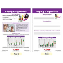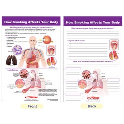 Graphically stimulating, well-organized and highly educational, the Effects of Smoking & Vaping Bulletin Board Chart Set provides an excellent reference resource for your classroom/gym bulletin board or wall, or as a hands-on activity for instruction, review and reinforcement for students in your Physical Education or Health Education programs. The Effects of Smoking & Vaping Bulletin Board Chart Set includes a collection of 6 individual 12” x 18” laminated charts, each covering a separate, curriculum topic. Uniquely designed, Side 1 features a graphic overview of the topic while Side 2 provides “write-on/wipe-off” activity exercises for review and reinforcement. Graphic images and hands-on activities combine to provide comprehensive coverage of essential student information. Perfect for classroom, gym or hallway reference or for use in learning centers/small group activities; independent study and remediation; or as a teacher resource for introduction and review of key concepts. Topics covered: Nicotine Addiction; Nicotine & the Brain; Vaping E-Cigarettes; How Smoking Effects Your Body; Second-Hand Smoke; and Getting Help to Quit Smoking.Features