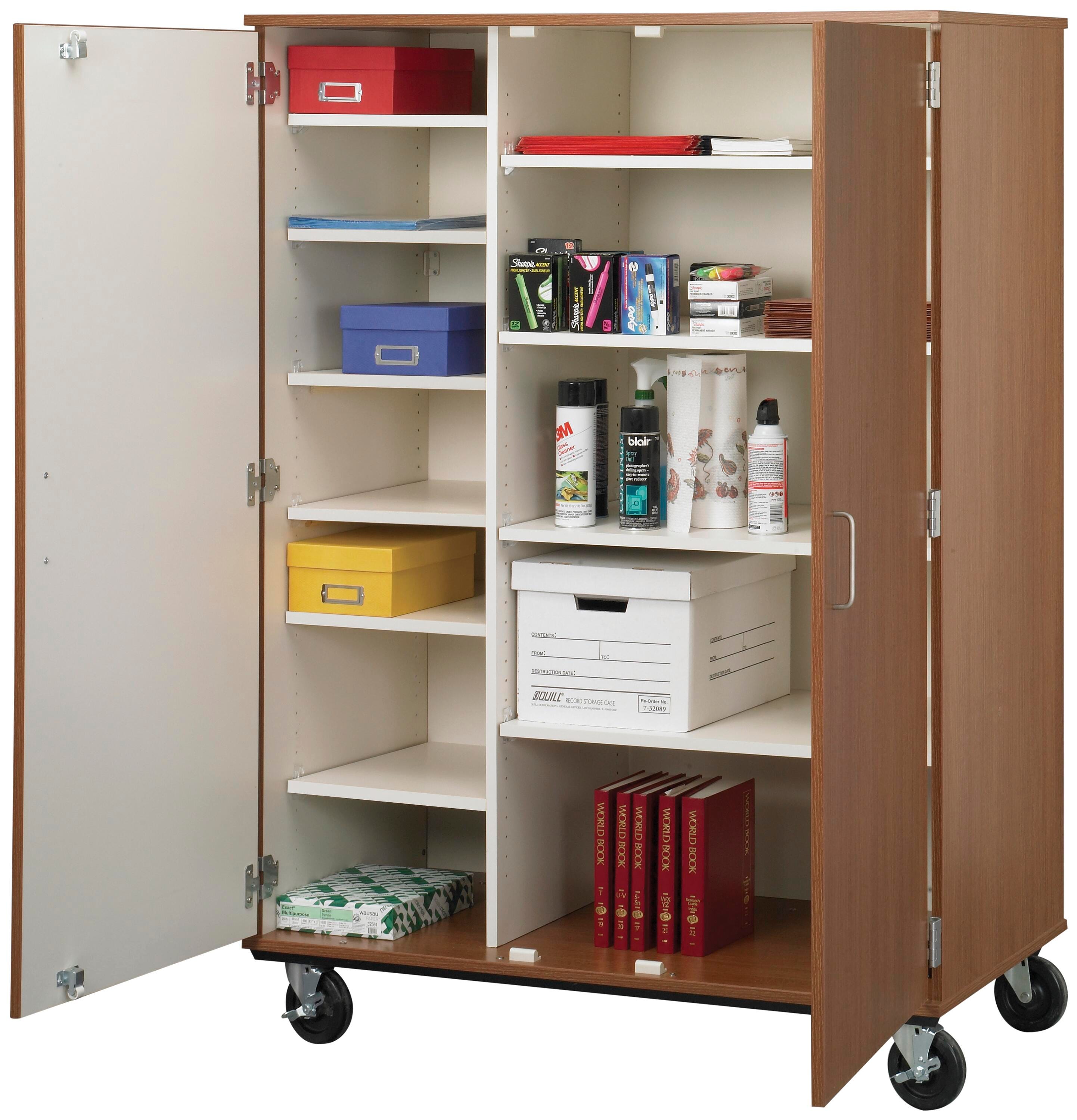 Designed with seven smaller compartments and five larger compartments secured behind two solid doors, this mobile unit has the perfect spot to store your items, and the specially designed casters make it easy to roll your storage system to another classroom or out of the way in your classroom. Other features include a patented five-knuckle hinge system that allows the door to swing open to 270 degrees. Heavy duty, spring loaded door catches keep doors securely closed. Lock has 6 tumblers with dead bolt mechanism for added security. Since this unit comes fully assembled, including the casters, it is ready to go! Measures 48 W x 24 D x 67 H inches.Features