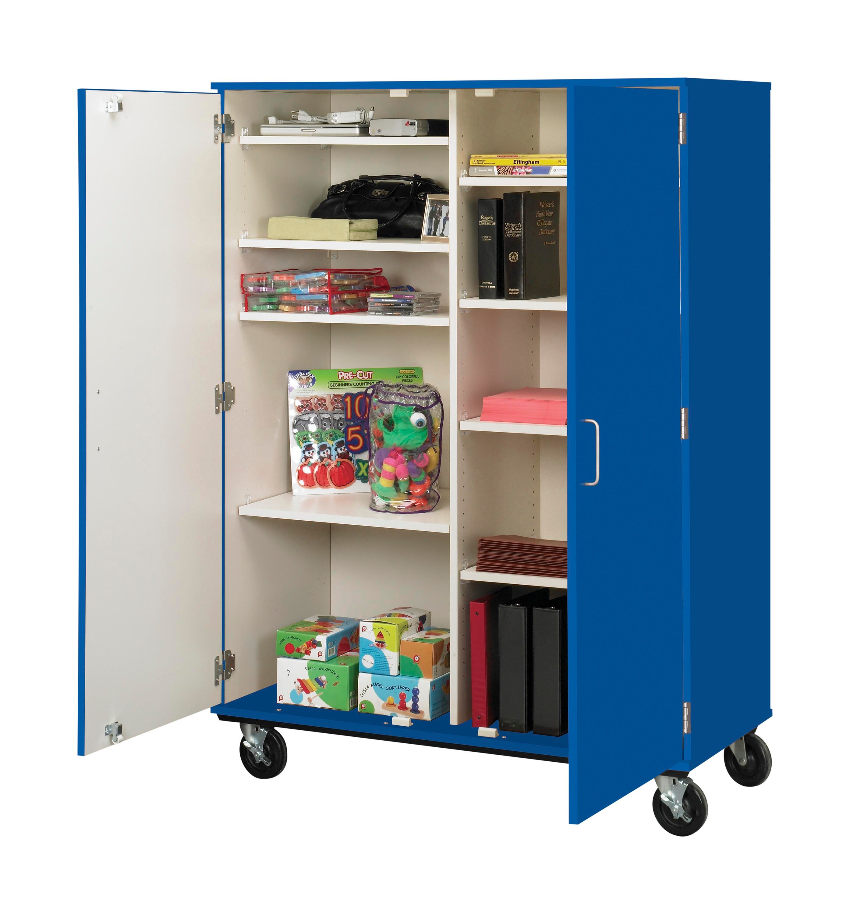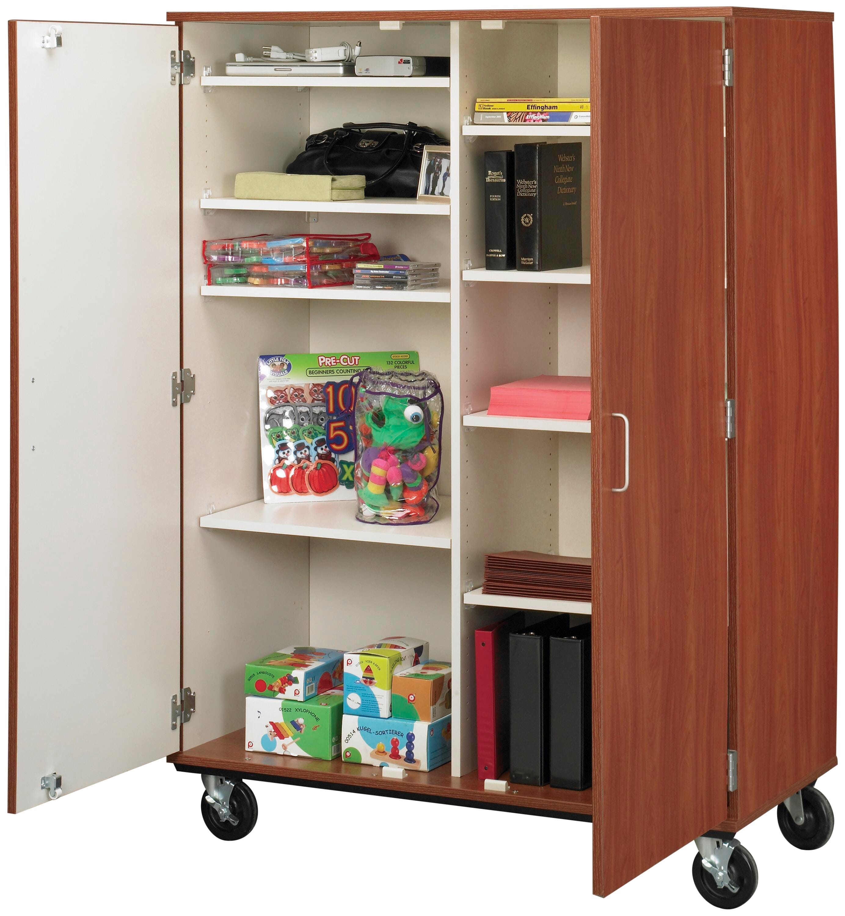 Designed with eight adjustable shelves behind two solid doors, this mobile unit allows you to create the perfect compartment size to store your items, and the specially designed casters make it easy to roll your storage system to another classroom or out of the way in your classroom. Other features include a patented five-knuckle hinge system that allows the door to swing open to 270 degrees. Heavy duty, spring loaded door catches keep doors securely closed. Since this unit comes fully assembled, including the casters, it is ready to go! Measures 48 W x 24 D x 67 H inches.Features