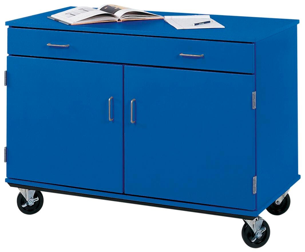 Storage on the move! Flexible classroom storage with full-width top drawer. Large bottom storage area with doors has a full-width adjustable shelf.