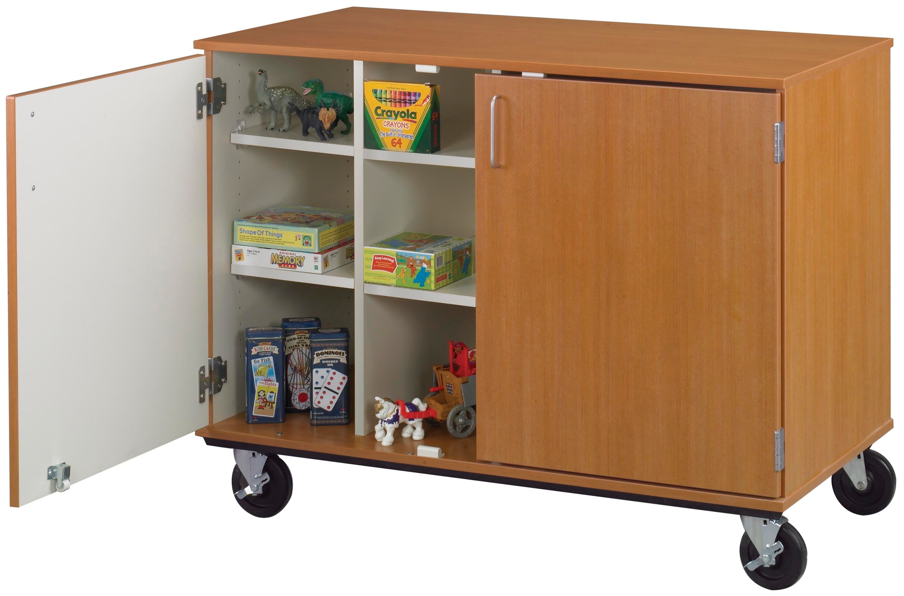 Featuring twelve compartments with adjustable shelves, this unit is not only versatile, but you also can easily transport items from one place to the next. This mobile unit has the perfect spot to store your items, and the specially designed casters make it easy to roll your storage system to another classroom or out of the way in your classroom. Other features include a patented five-knuckle hinge system that allows the door to swing open to 270 degrees. Heavy duty, spring loaded door catches keep doors securely closed. Lock has 6 tumblers with dead bolt mechanism for added security. Since this unit comes fully assembled, including the casters, it is ready to go! Measures 48 W x 24 D x 36 H inches.Features