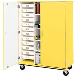With four adjustable shelves in the right storage area and twelve trays in the left storage area, this unit is a great addition to any classroom or work area. The four adjustable shelves allow you to create the perfect compartment size to fit your needs, and the tray storage, which includes label holders, allows you to easily access stored items. The specially designed casters make it easy to roll your storage system to another classroom or out of the way in your classroom. Other features include a patented five-knuckle hinge system that allows the door to swing open to 270 degrees. Lock has six tumblers with dead bolt mechanism for added security. Since this unit comes fully assembled, including the casters, it is ready to go! Measures 48 W x 24 D x 67 H inches; trays measure 14-1/4 W x 19 D x3-1/2 H inches.Features