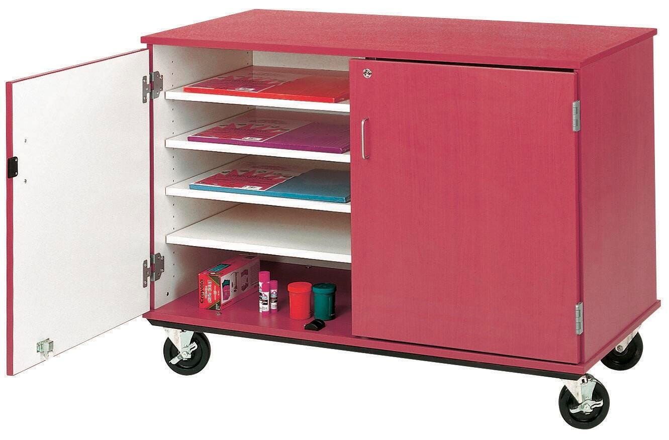 Designed with eight adjustable shelves behind two solid doors, this open shelf, mobile unit allows you to create the perfect size compartment to store your supplies, and the specially designed casters make it easy to roll your storage system to another classroom or out of the way in your classroom. Other features include a patented five-knuckle hinge system that allows the door to swing open to 270 degrees. Since this unit comes fully assembled, including the casters, it is ready to go! Measures 48 W x 24 D x 36 H inches.