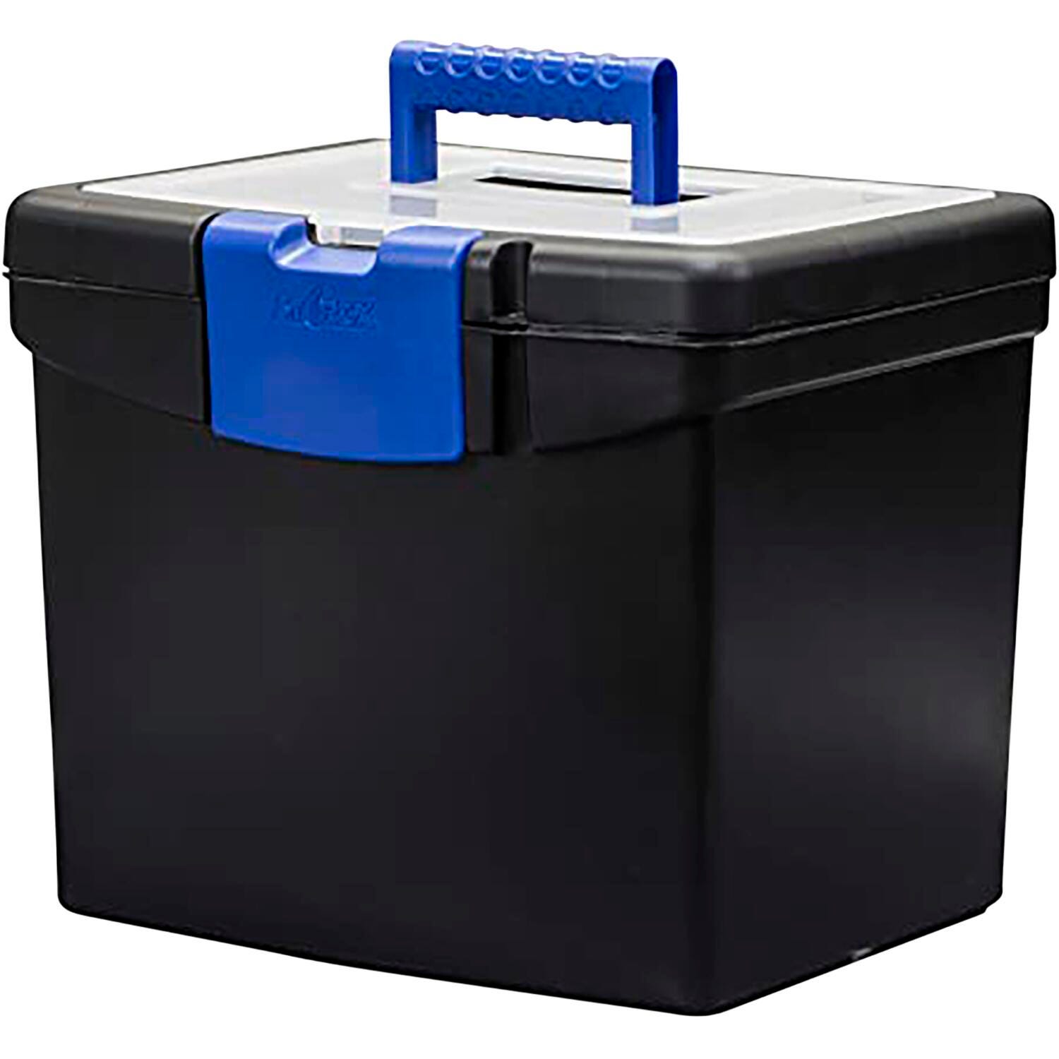 - Heavy-duty plastic file box with easy-grip handle and latch provides safer, water-proof alternative for maintaining/transporting important files than a cardboard banker box