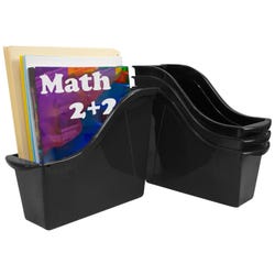 Keep your reading material organized and within easy reach with the Storex Interlocking Book Bin. This versatile plastic bin can be linked together with other Storex book bins to make a long, sturdy bookcase, and/or be used singularly to carry a set of books to your reading corner. The handles are perfectly sized for big and small hands. Small bin size (at 11-3/4 L x 8-1/2 H x 4-1/2 W inches) fits into narrow 12-inch bookcases and accommodates taller books and letter-size file folders inside. Black Bin is also available in other bright colors, which are all ideal for early childhood classrooms or STEM and STEAM material organization. Label pouches sold separately. Colors may vary.Features