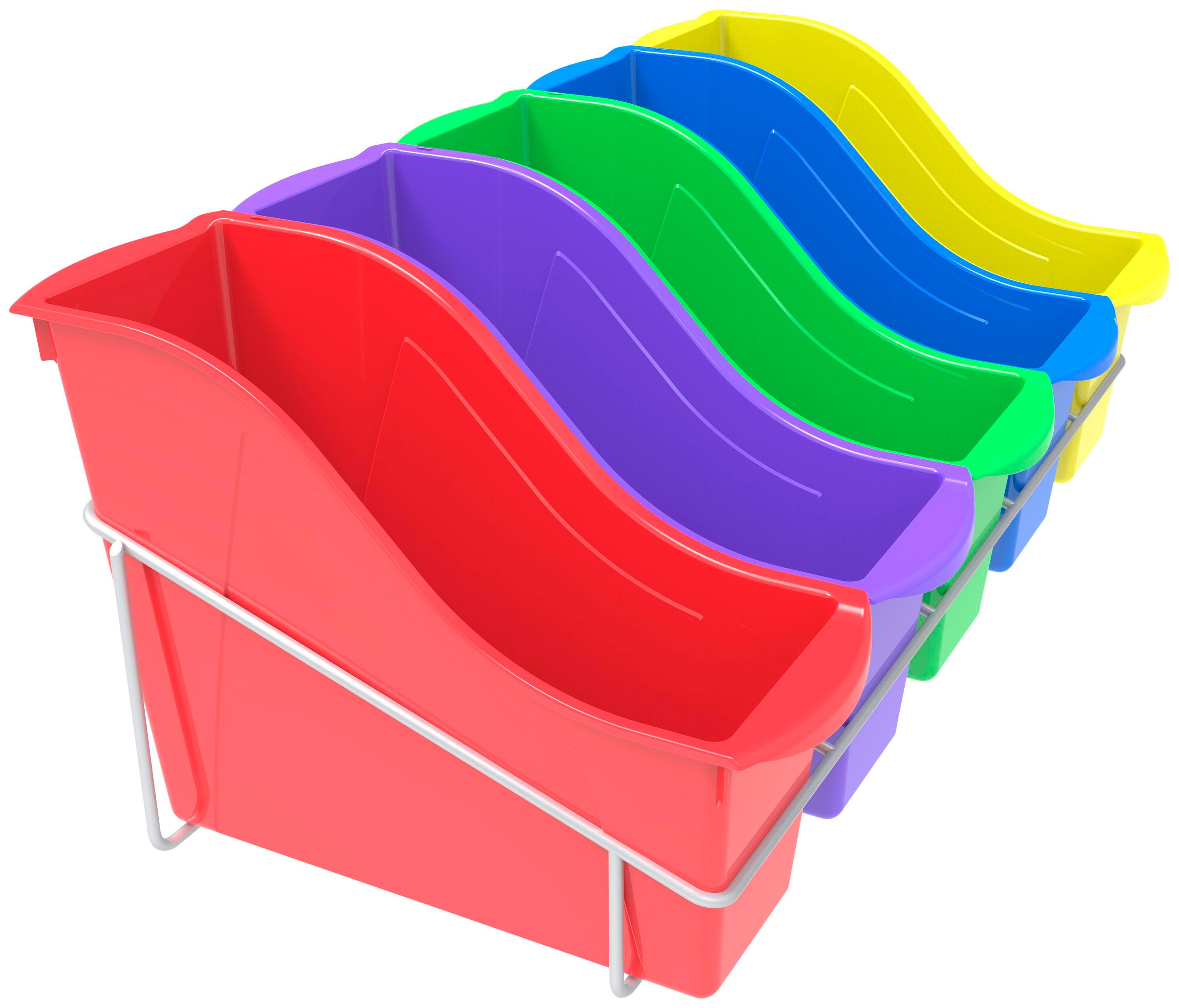 Easily display the Storex Small Book Bins with this charming and convenient metal shelf rack. The metal wire rack is made white epoxy coated steel for ultimate durability. The bins will not tip over when placed in the rack, even when they are overloaded with books. Perfect for a reading corners or STEM / STEAM organizing. Fits on desktops or 12 inch shelves. Can be wall mounted; hardware not included. Bins not included. Colors may vary.Features