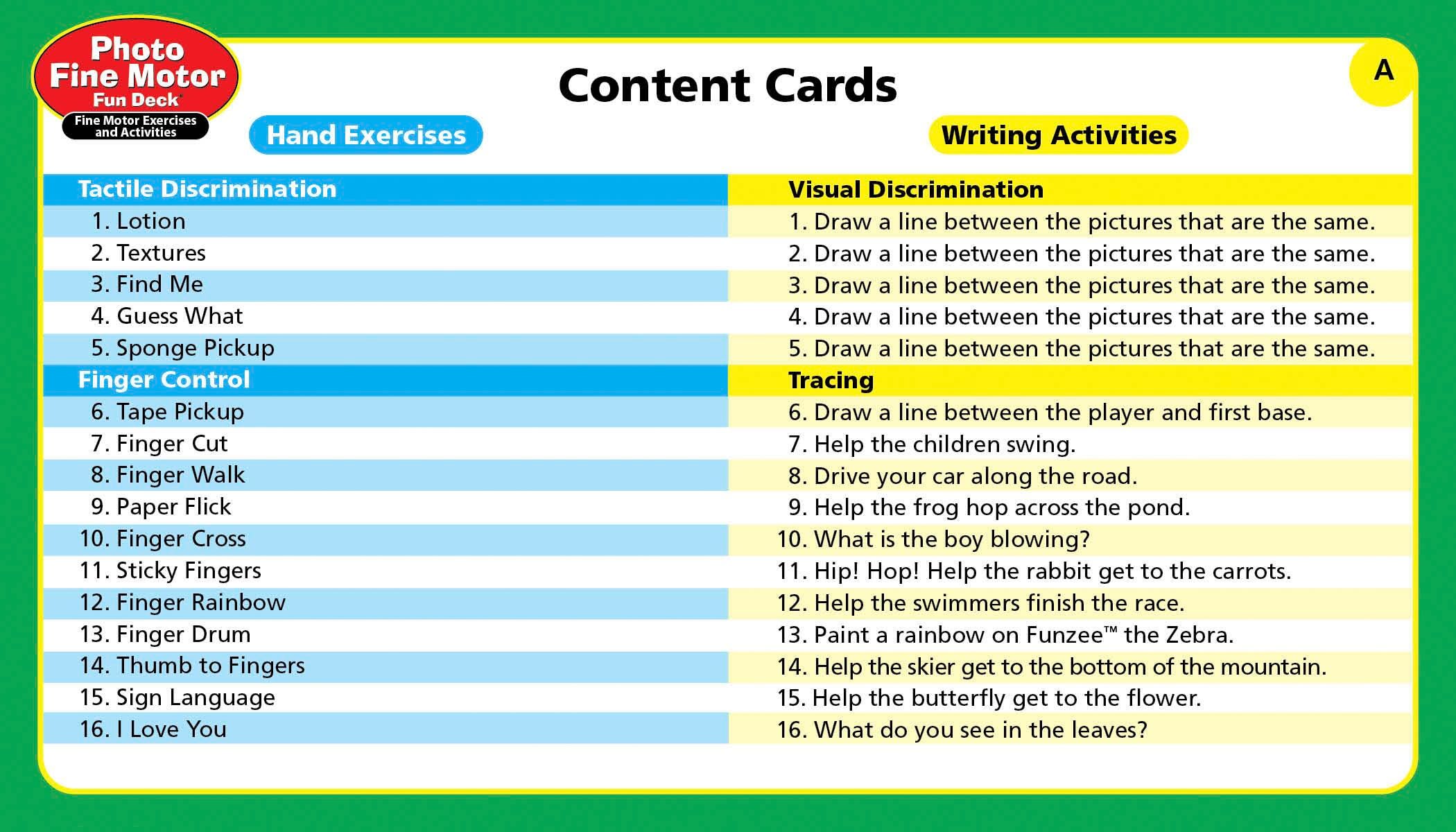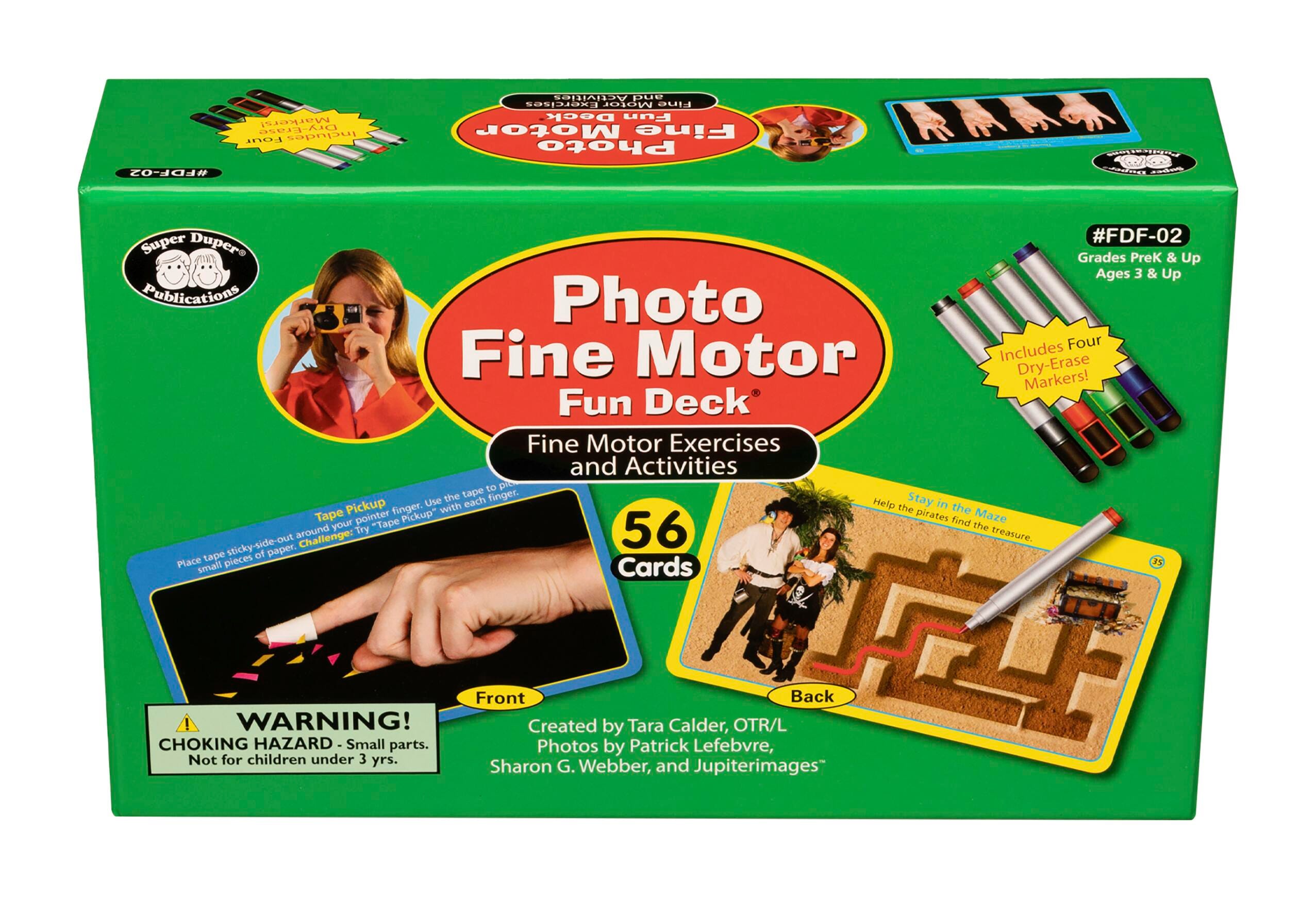 Give the small muscles in your kids’ hands and fingers a workout to remember! With the Photo Fine Motor Fun Deck, children will boost their handwriting abilities, improve hand-eye coordination, and love every minute of it! This double-sided, 56-card set strengthens fine-motor, visual-motor, and perceptual skills which are so important for handwriting and building independence. A full-color photo on the front of each card shows exactly how to perform the hand exercise. The photo on the back side of each card presents a pre-writing activity. So get those little fingers snapping, grasping, and crossing! Then, flip the card and trace the lines, connect the dots, draw pictures, or write simple words with the dry-erase markers also in this set!