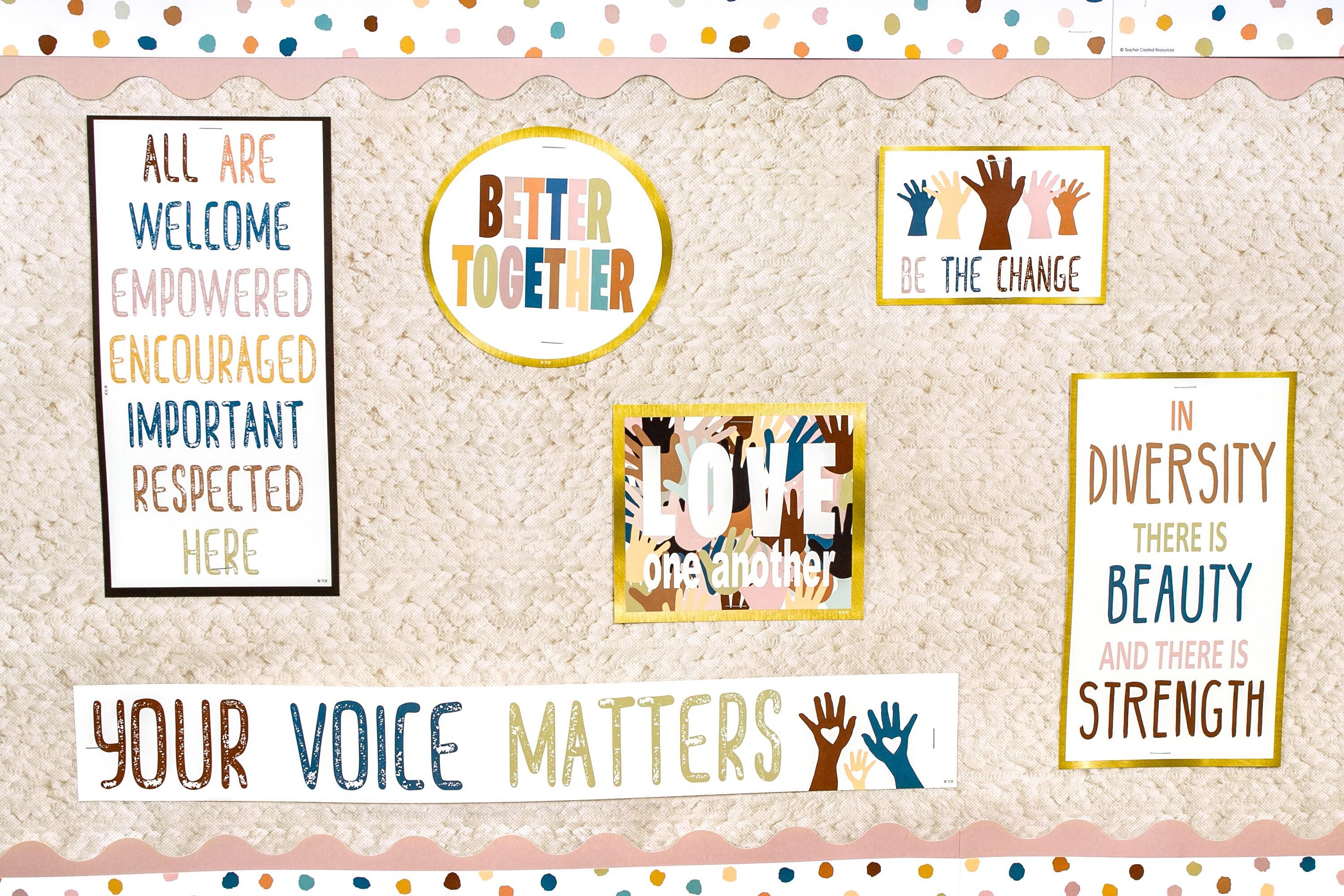 Students will be encouraged and empowered through these positive messages and affirmations that they can truly change the world. At Teacher Created Resources we help teachers create stimulating learning environments by producing colorful classroom decor. Many of our products easily crossover from the school environment to meet the needs of parents at home! The Everyone Belongs piece measures 20-1/8 inches x 2-3/4 inches.