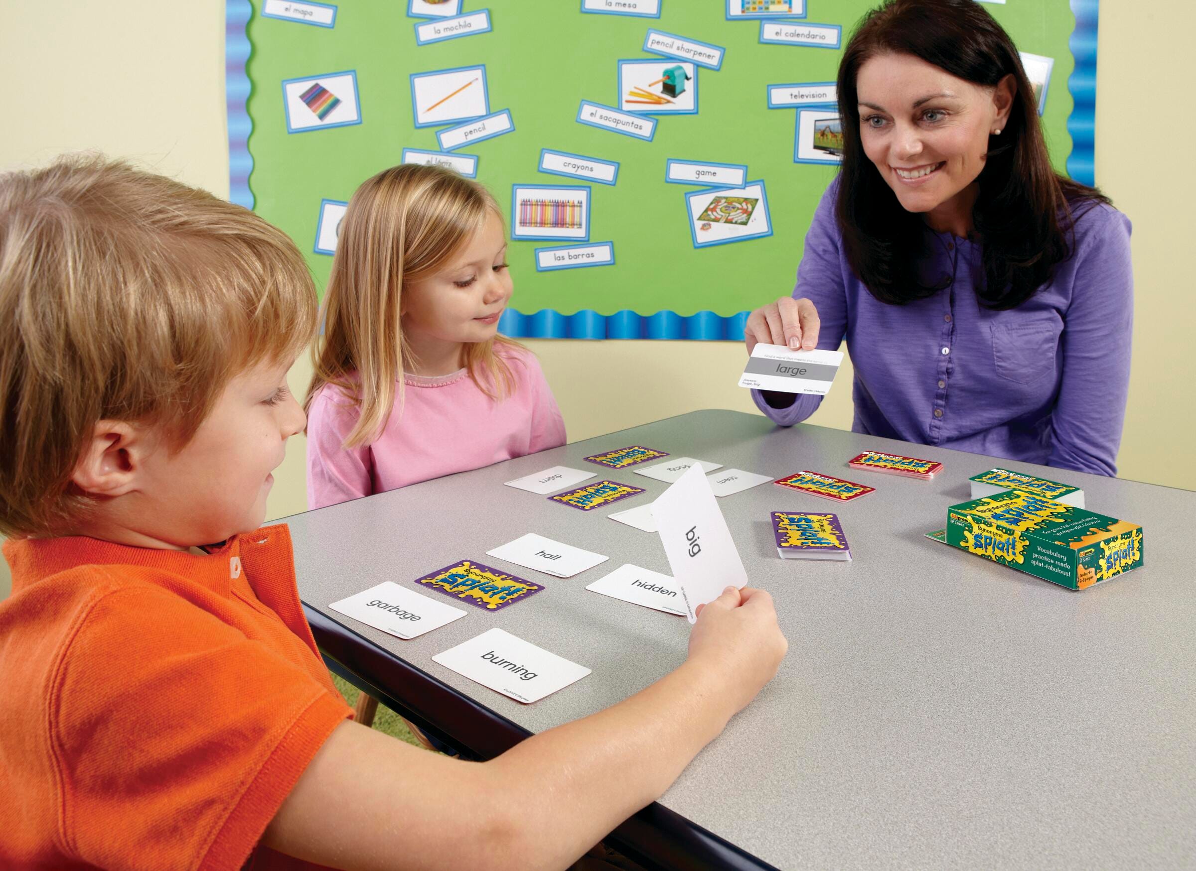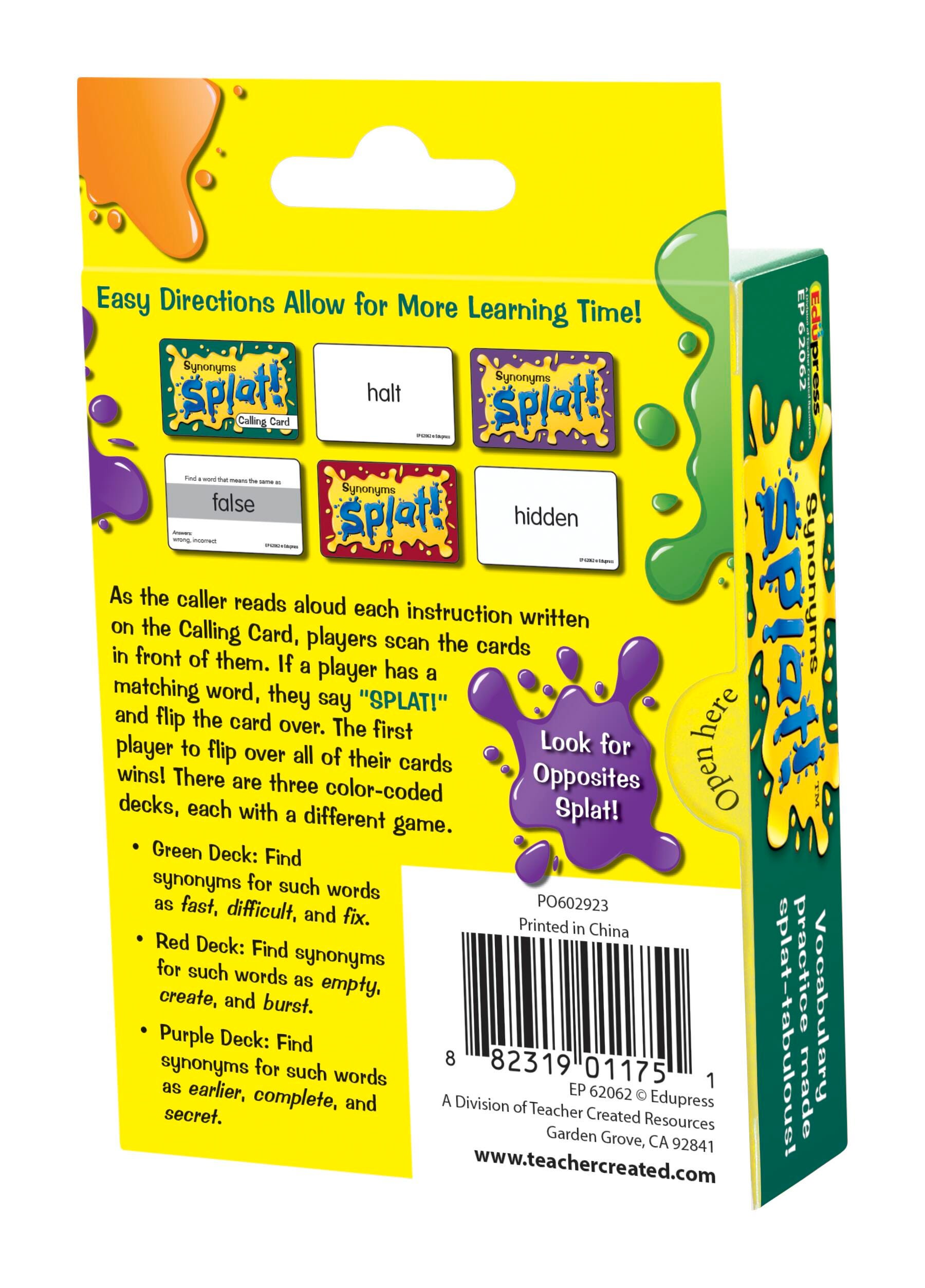 Fast-paced games provide practice for beginning reading skills! As the caller reads each card aloud, players scan the cards in front of them. If the player’s card matches the clue, the player says “SPLAT!” and flips the card over. The first player to flip over all of their cards wins. With three color-coded decks, there are three games in every Splat! box. For 2-6 players. Appropriate for age 7 and up.