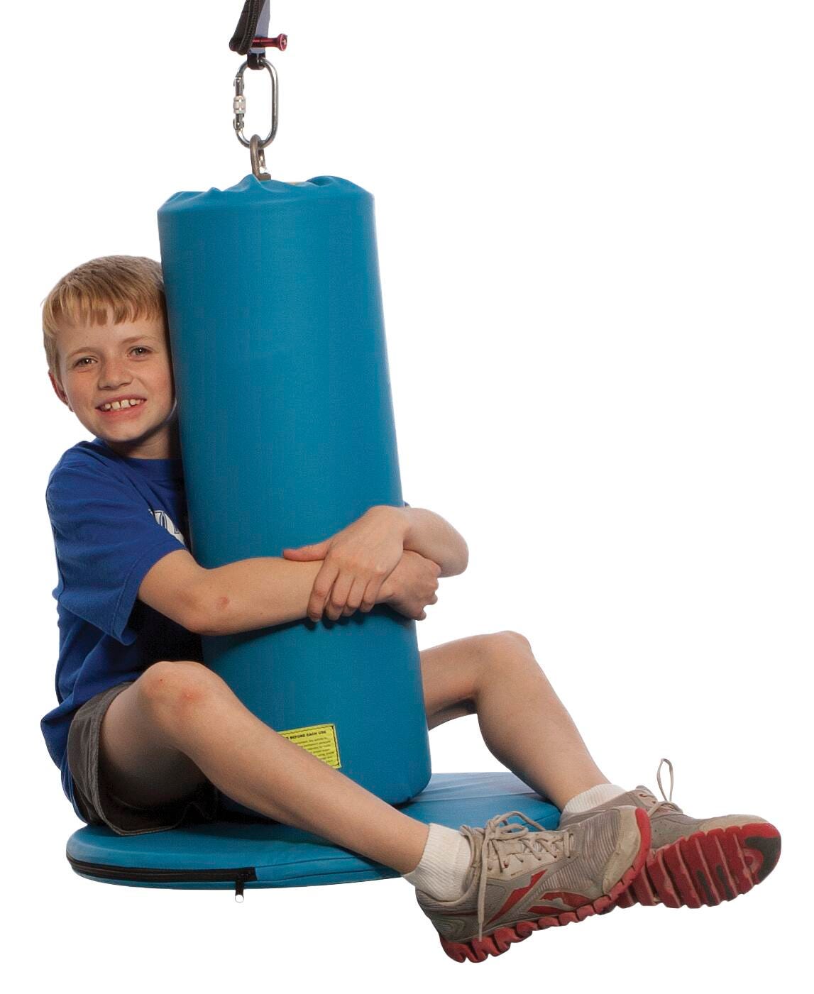 The vertical bolster on the flying saucer swing provides an intense sensory challenge. This substantially cushioned swing is covered in smooth vinyl with a firm circular base. Comes with one safety snap for a single point of attachment. A minimum ceiling height of 8 feet is required. Swing can accommodate up to 200 pounds and measures 34 x 24 inches.Includes:
