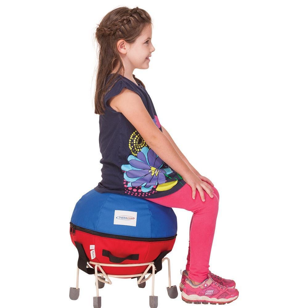 The TheraGym SensaDome stability ball chair brings the benefit of movement and activity while sitting with complete stability. Offering innovative seating alternative for home, school, and therapeutic settings also helps improve posture and maintain muscle tone. Enjoy a stimulating and energy absorbing break from conventional seating. Latex-free stability therapy ball in a zip off washable cover. Covers are cold water washable (do not place in dryer). Durable steel base with molded, sturdy rubber feet. 300 lbs capacity. Small/Medium User Height is 34-45 inches.Includes: