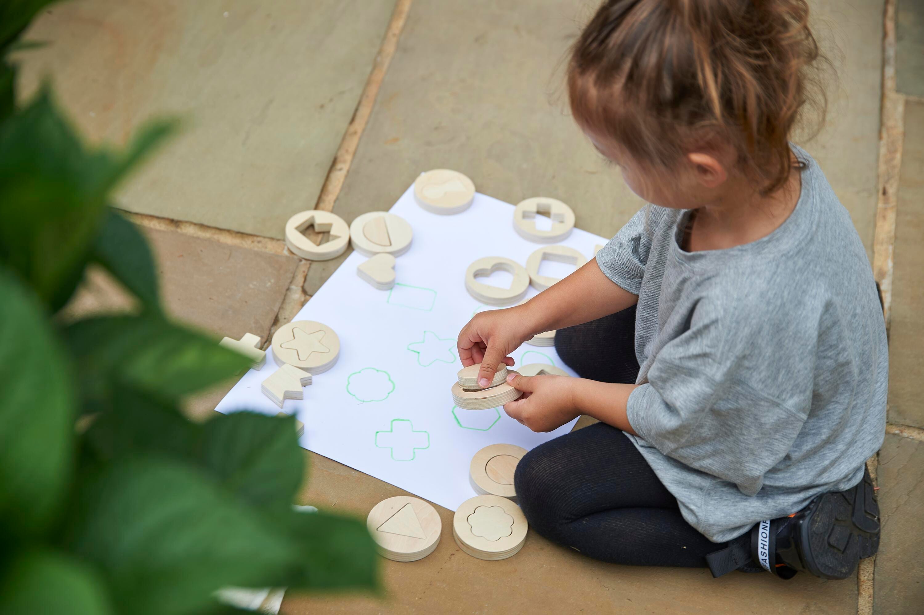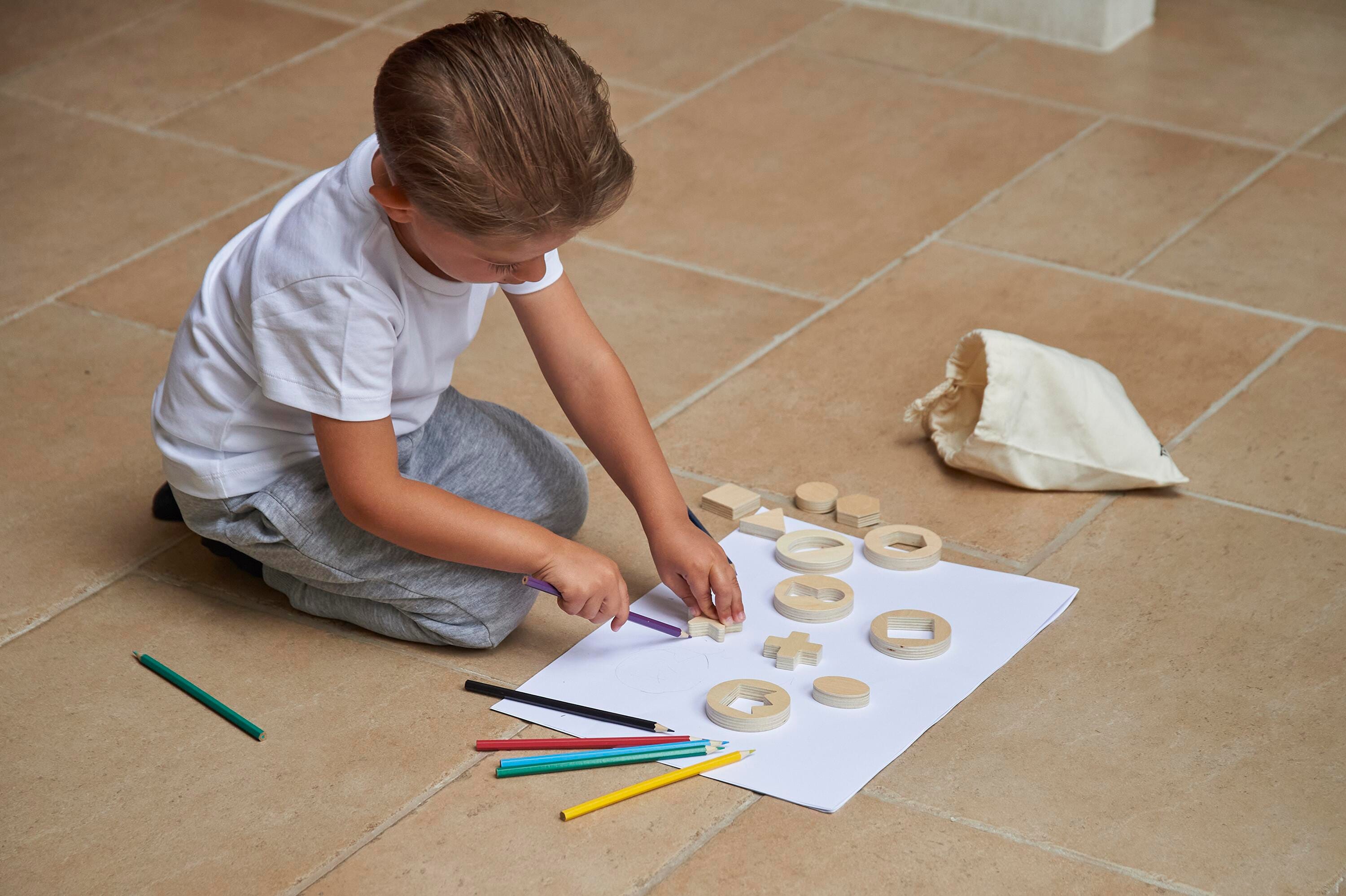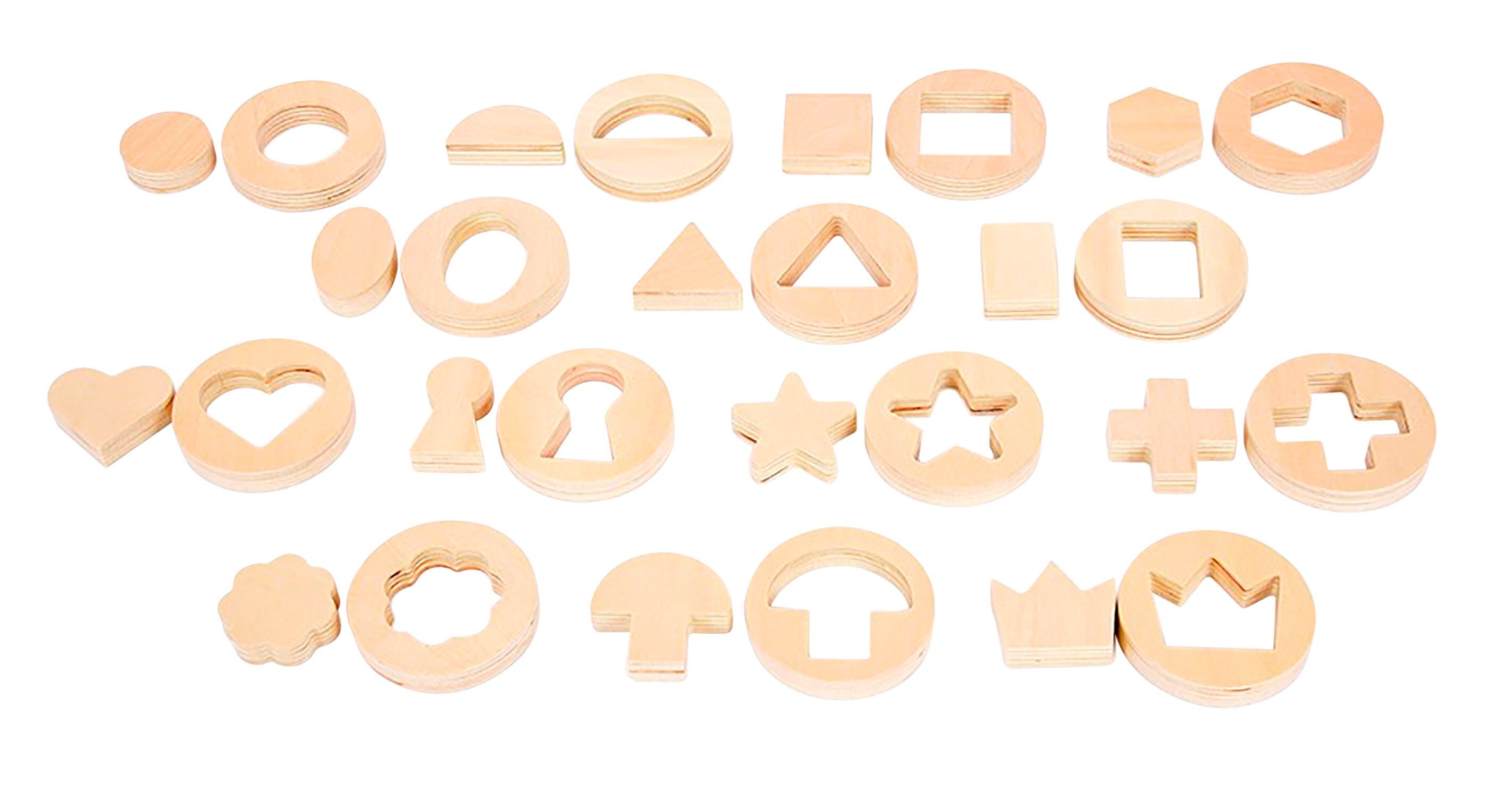 This set comes with 14 smooth birch plywood disks. Each disk features a removable shape cutout. There are 7 mathematical shapes (circle, oval, semicircle, triangle, square, rectangle, and hexagon) and 7 environmental shapes (mushroom, star, keyhole, crown, cross, flower, and heart). Use these disks to practice sorting, matching, shape recognition, spatial reasoning, and more. Help children explore the difference between regular and irregular shapes while using descriptive language, concentration, fine motor skills, and critical thinking. For ages 12 months and beyond. Disks measure 2.6 L x 0.5 H inches.