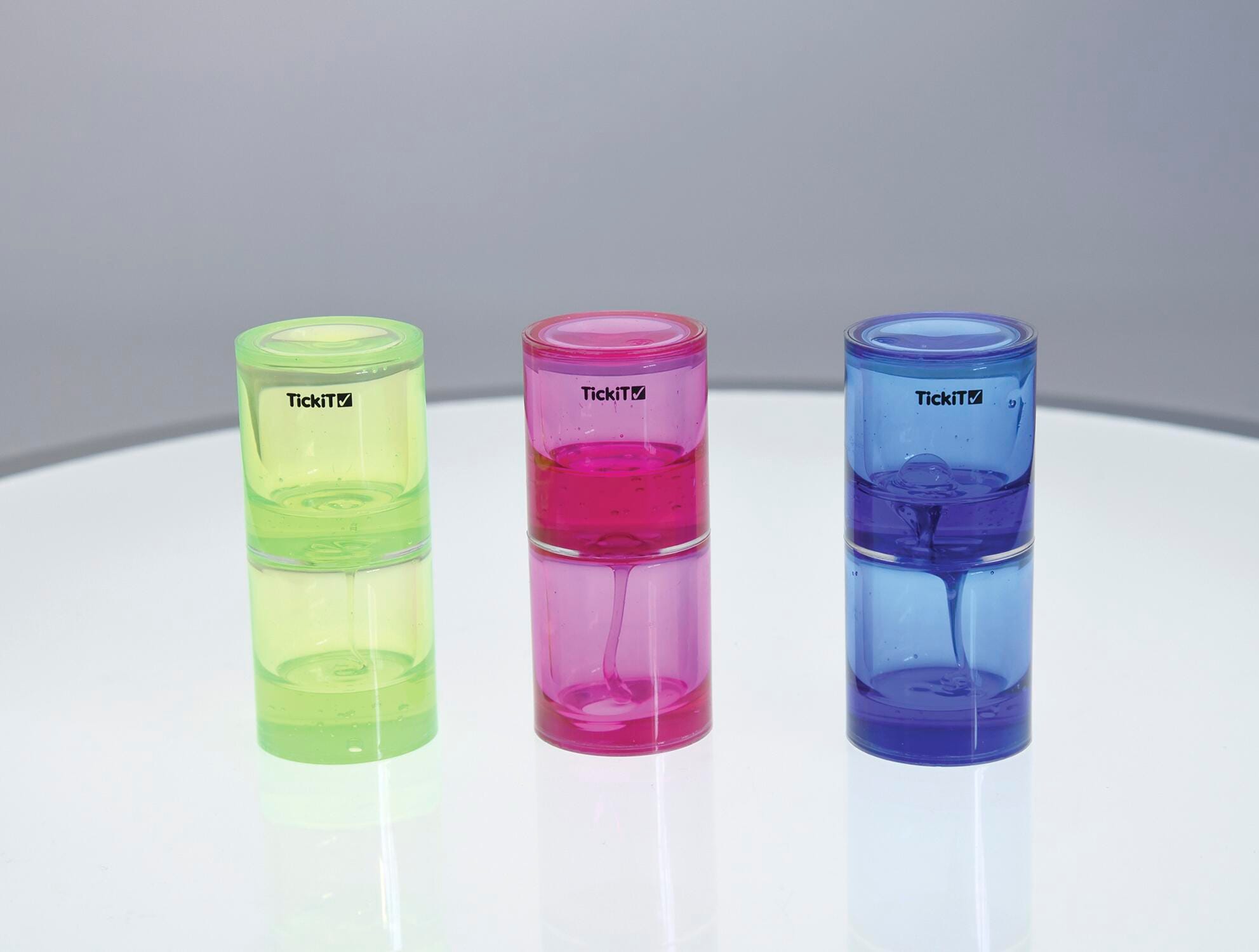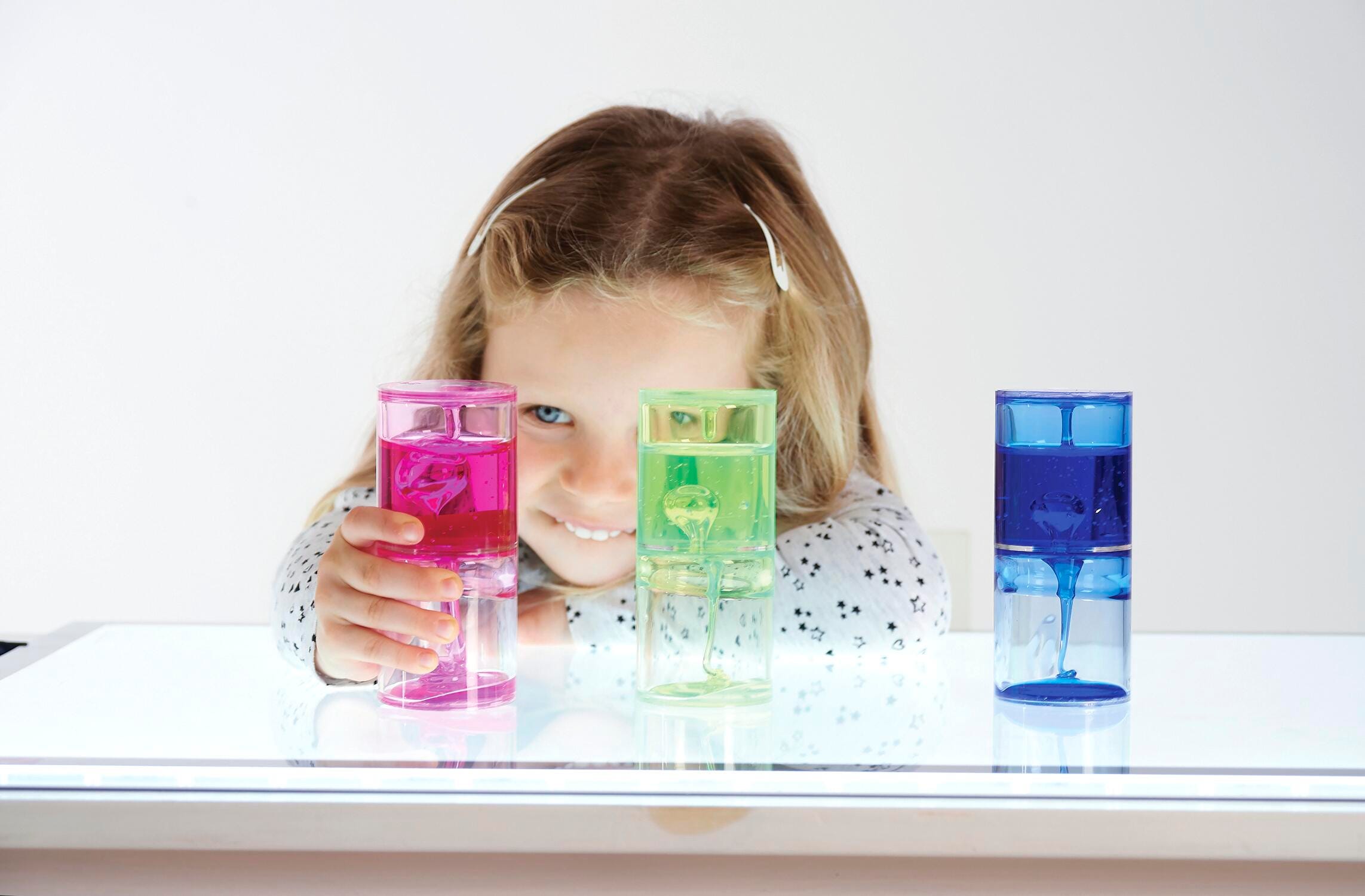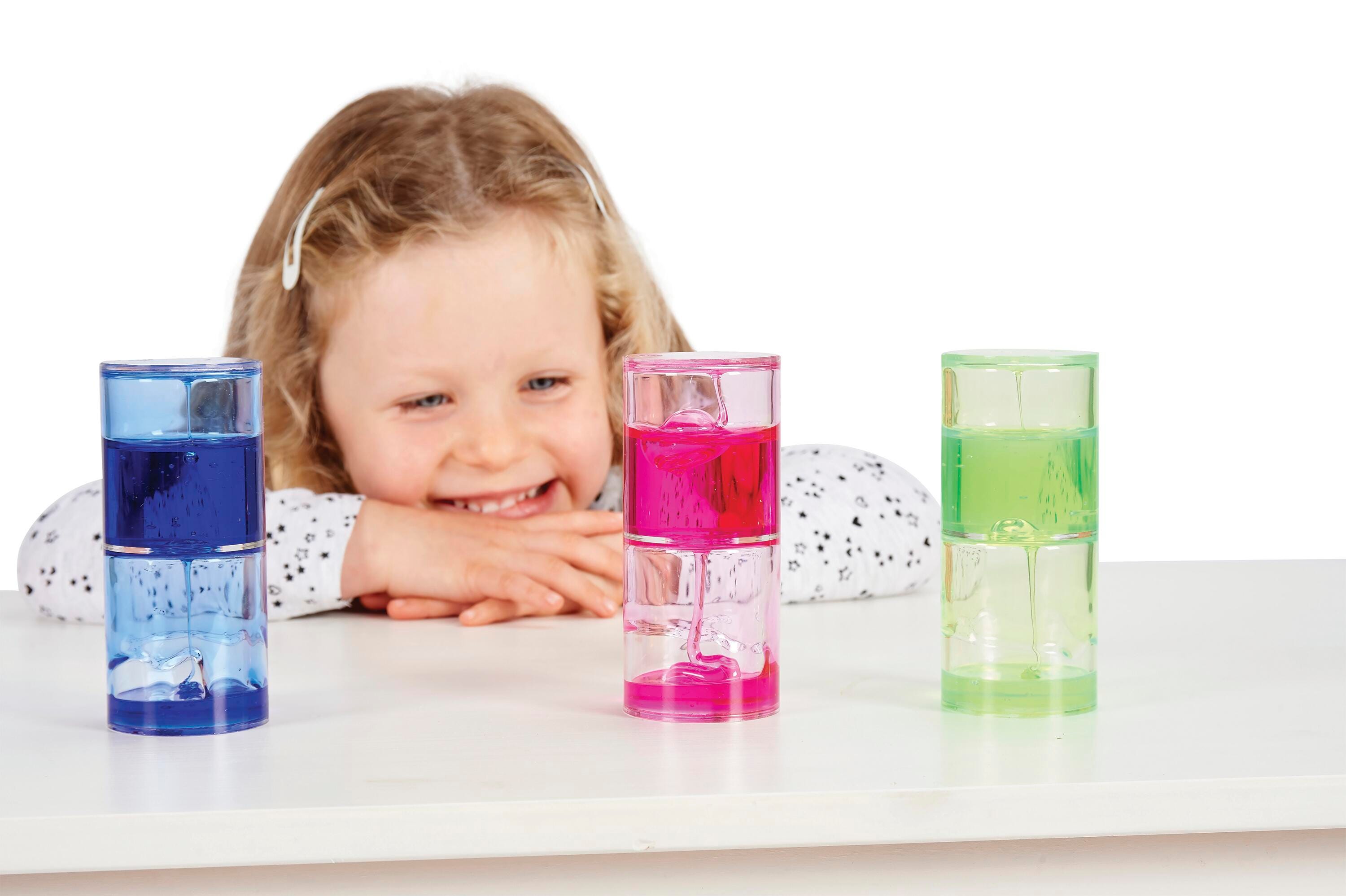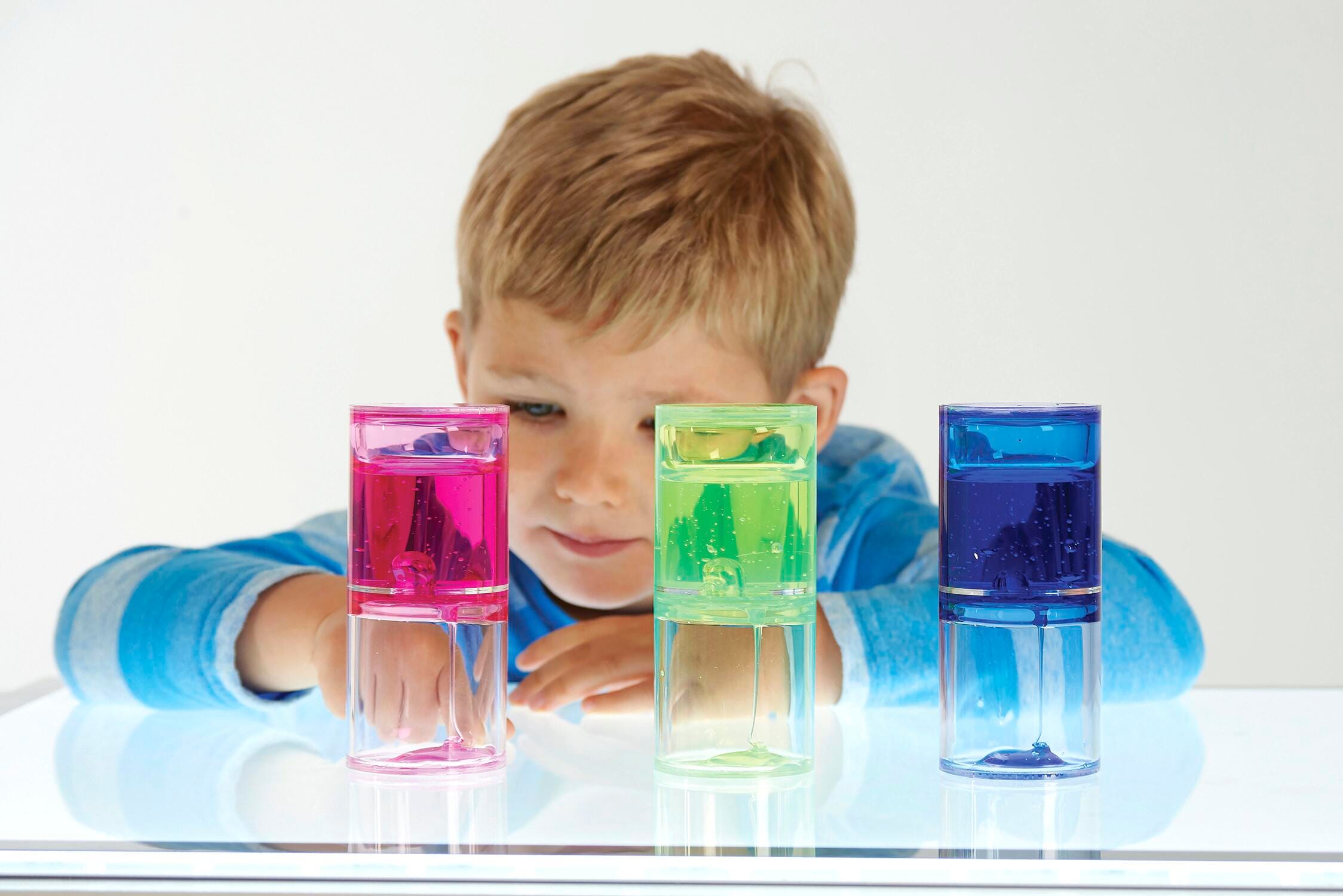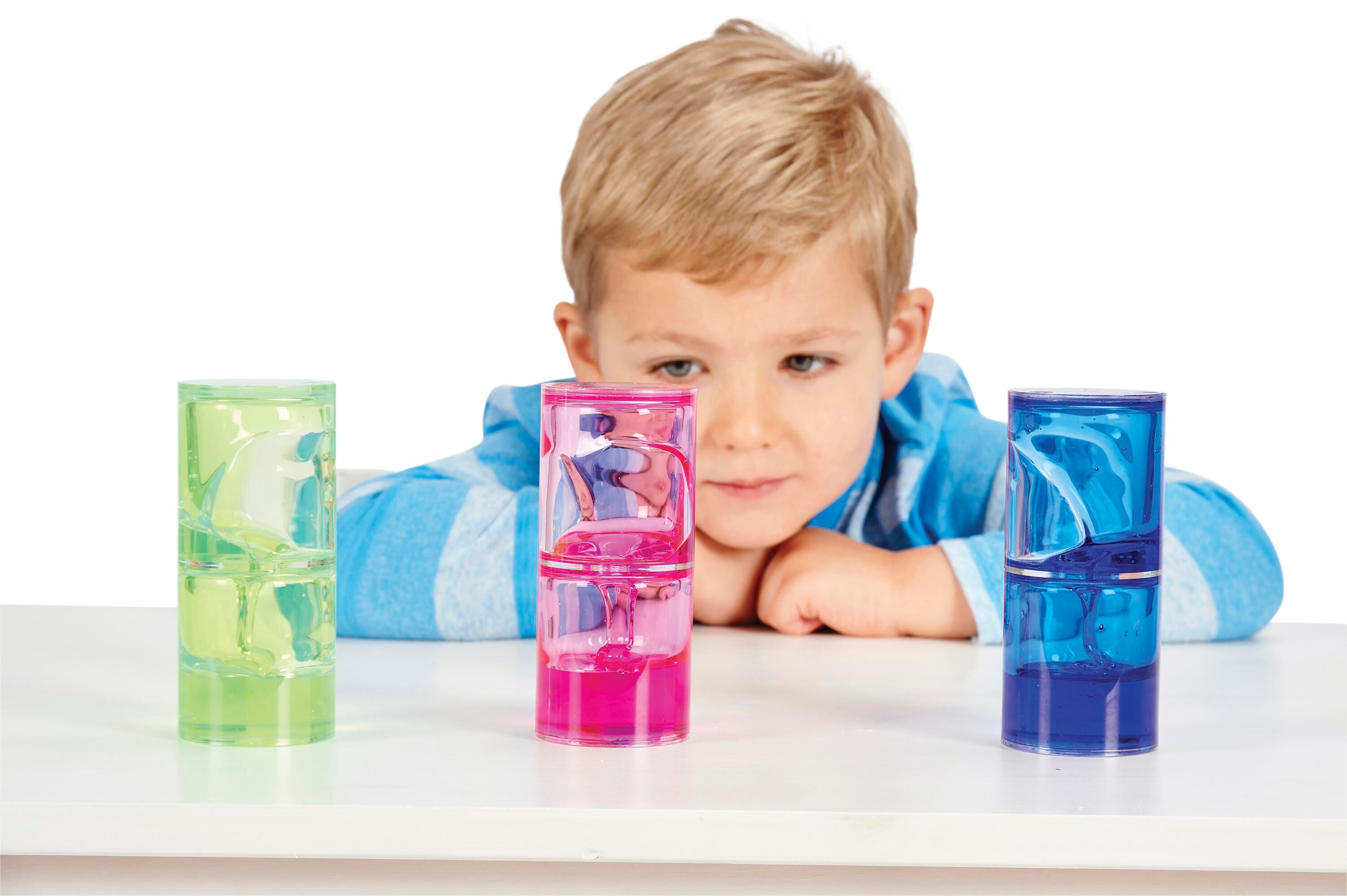 Ooey, gooey, and so much fun! These Sensory Ooze Tubes slowly churn out thick, goopy jelly that spirals down to the bottom of the base. Kids and teachers can simply turn the tube upside to watch oozing colored droplets form and fall (or soar upwards) from chamber to chamber, depending on how tube is turned. Substance is made of colored oil and water. Each clear, color tinted bottle has same colored jelly inside. Perfect for pure viewing entertainment or explaining science and gravity to young classrooms. Safe for ages 3 and up.