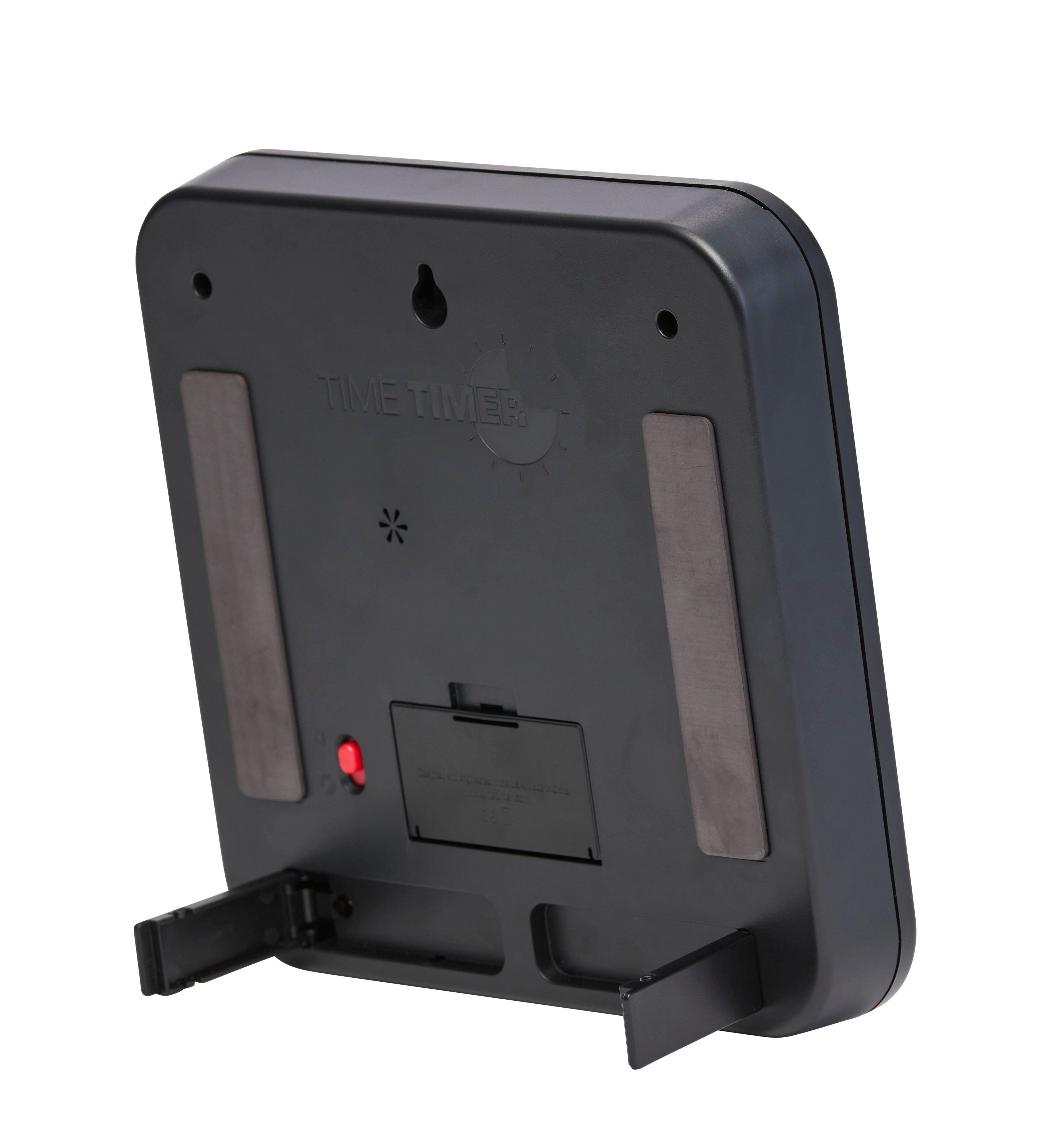 Strong magnets allow the Time Timer to be displayed on a markerboard, refrigerator, file cabinet, or any metallic material, but it can also stand alone or hang on the wall