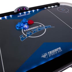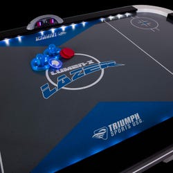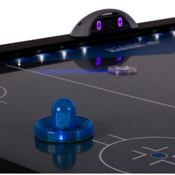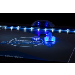 This interactive table features in rail LED lighting and cascading effects with in game music. Even more fun with the two ultra-bright strikers and pucks. The dual motor blowers provides a fast and furious game play with continuous air flow. Electronic scoring so you will never lose track of the score. MDF engineered play surface with white and blue silkscreen playfield lines. Table measures 72L x 40W x 31H inches. The table is supported by 12 mm thick legs with four 2-1/2 inch leg levelers to ensure play surface remains perfectly flat even if the floor is not level.