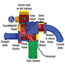 The UltraPlay Discovery Range Discovery Center offers space for up to 25 children, one of UltraPlay's largest play structures yet! This discovery play center provides a variety of developmental and educational activities that reinforce imagination from the TouchMath Learning Panel to the longest slide on any UltraPlay Discovery Center. While children play, teachers and parents can easily supervise through several window panels. This set includes a ground spike mounting kit, is easy to install, and is commercially compliant. Available in the colorful Playful theme.Features