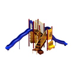 The Timber Glen Play Structure gives children the choice to make their own play experience. This structure features two slides at different heights to give children different sliding experiences. The Deluxe Rock Climber combines both upper and lower body strength while developing important motor skills. When children need a break, they can hang out on the Bench Panel or make music with the Bass Drum. This structure meets ADA guidelines and is commercially compliant with ASTM and CSPC. A ground spike surface mount is included with the structure, but an anchor bolt surface mount or in-ground mounting kit can be purchased separately. The posts are 13-gauge galvanized steel tubes and powder coated. The plastics are heavy-duty rotomolded & blow molded components. The critical fall height is 6 feet. Available in the colorful Playful theme.Features