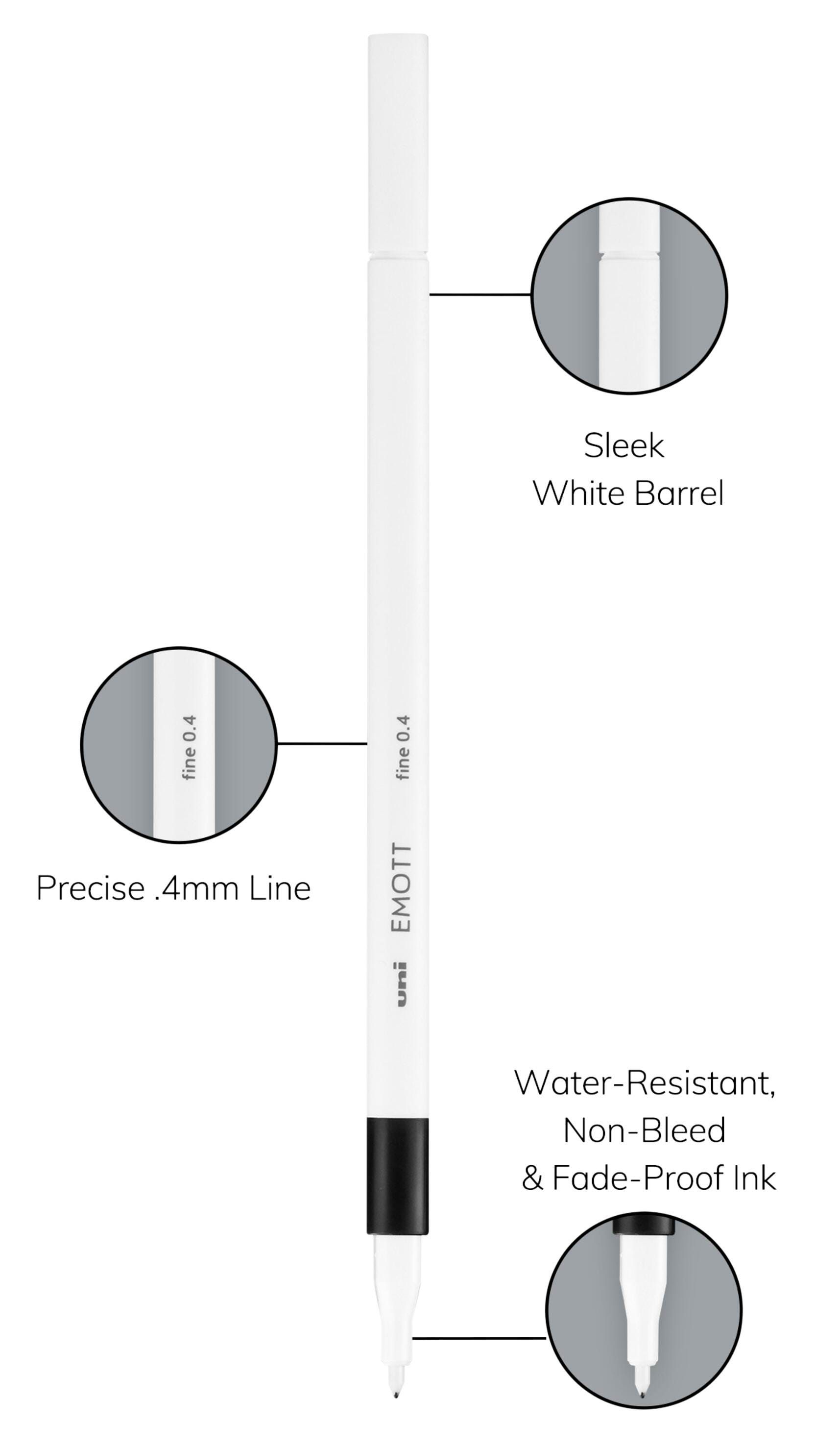 Writings and drawings come to life with EMOTT Fineliner Marker Pens. Ultra-precise, durable tip designed with a protective core prevents bending or splitting, delivering crisp lines with unparalleled definition. Newly developed ink is water-resistant, fade-proof and won’t smear or bleed.