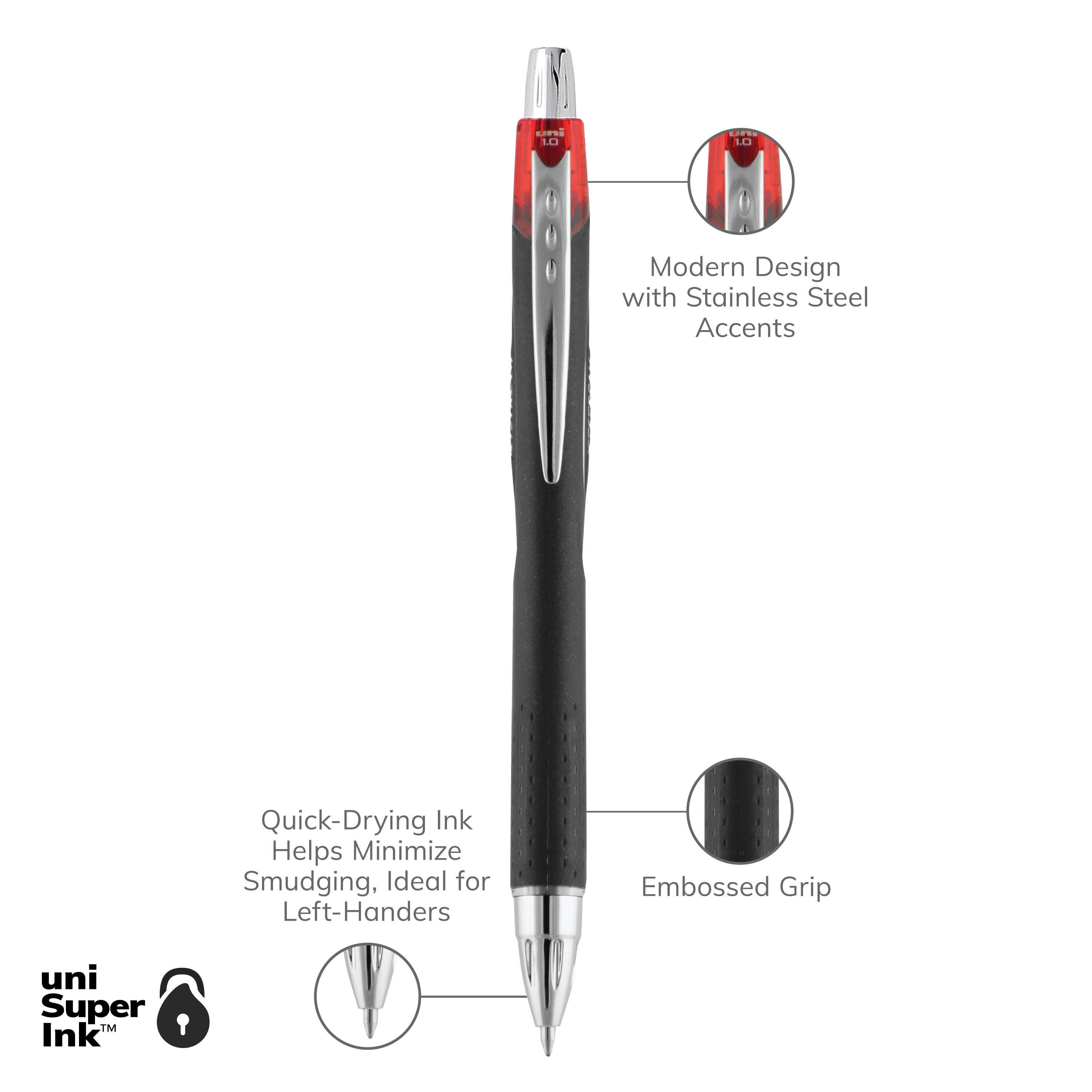 JETSTREAM RT black barrel retractable rollerball pen with red ink features 1 mm point. It has pigment based ink containing particles that form an unbreakable indelible bond. Pen has a special hybrid ink that provides smoothness of a gel with rapid drying properties of a ballpoint. It assists in protecting against check as well as document fraud with uni Super Ink. Water resistant.