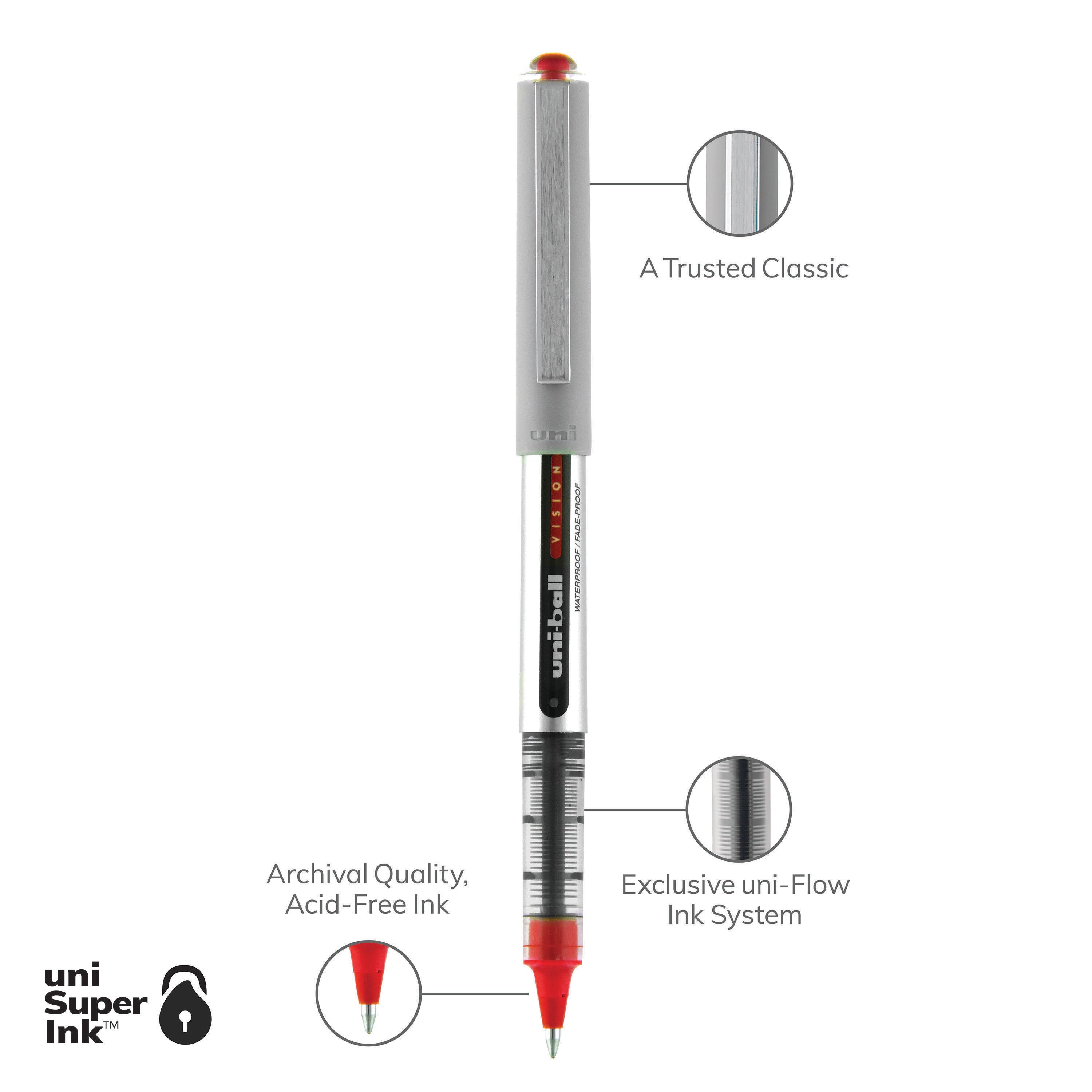The Rollerball pen has free flowing and fluid ink, similar to a fountain pen. You can actually feel the ball contacting the paper and see the ink flowing out of the pen as you write. Each roller pen features waterproof uni Super Ink which protects against water, fading, and fraud. Archival quality and acid free ink is great for documenting and record keeping. The larger particles deliver solid vivid colors every time you write.