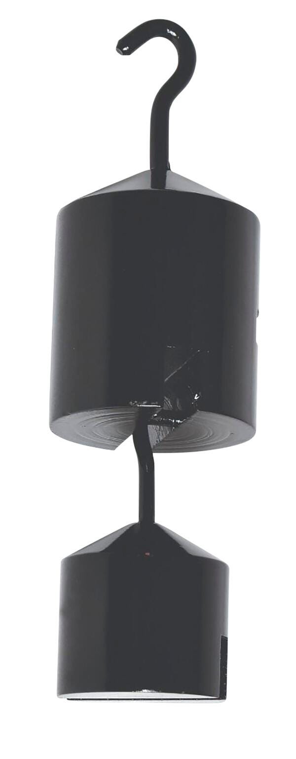 Set of nine hooked cast iron masses with black enamel finish, shipped in a plastic storage base. Includes one each 10g, 50g, 100g, 500g, 1000g, and two each 20g and 200g weights. Weights can be hooked in tandem.