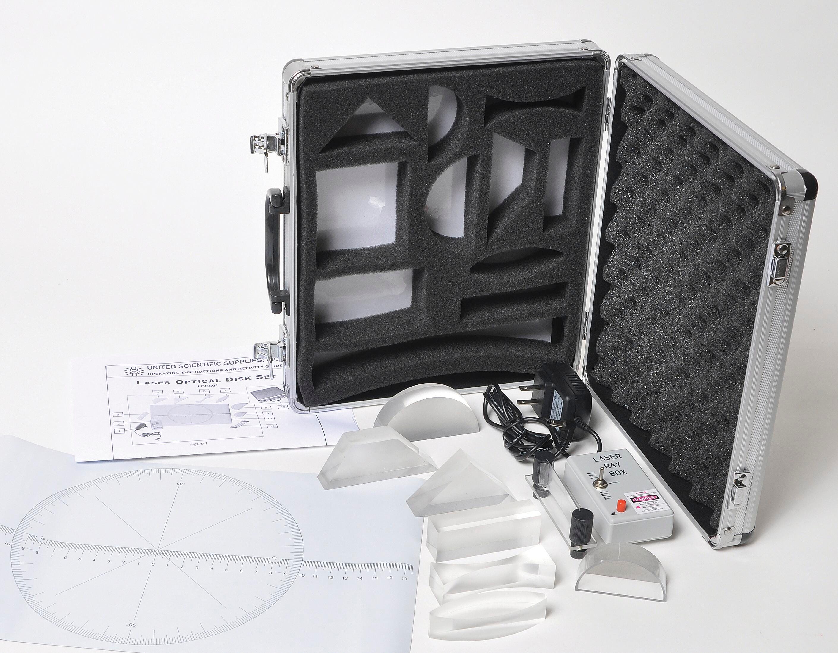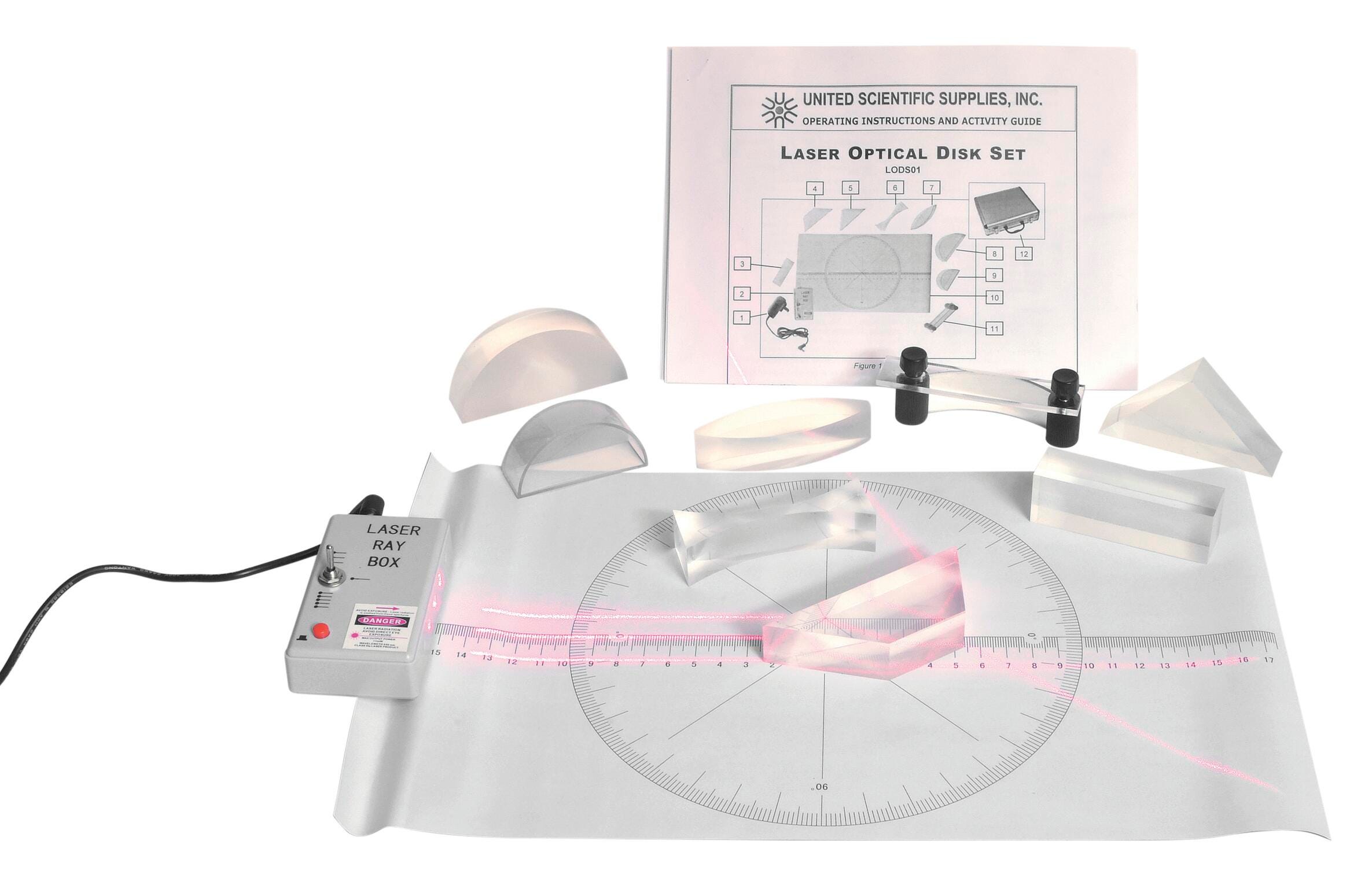 This is an excellent and economical set for introductory ray optics. The laser ray box projects one, three, or five parallel bright beams and is equipped with a momentary switch for safety. A vinyl template with a degree circle and a linear scale forms the optical disk, and the set includes seven clear acrylic optical elements and a mirror with adjustable curvature for investigating refraction, lenses, prisms and mirrors. The bottoms of the acrylic elements are frosted to show the ray paths inside them. The set also includes a manual and storage box.Features