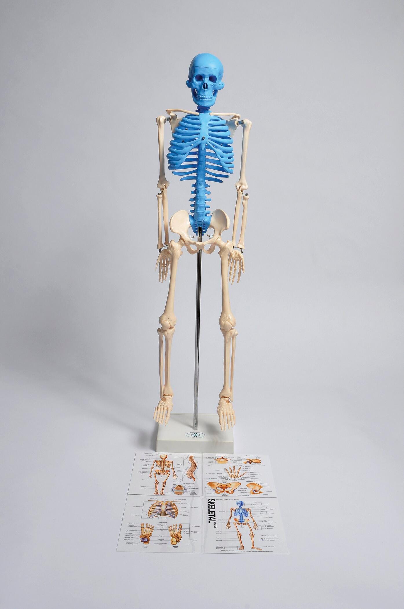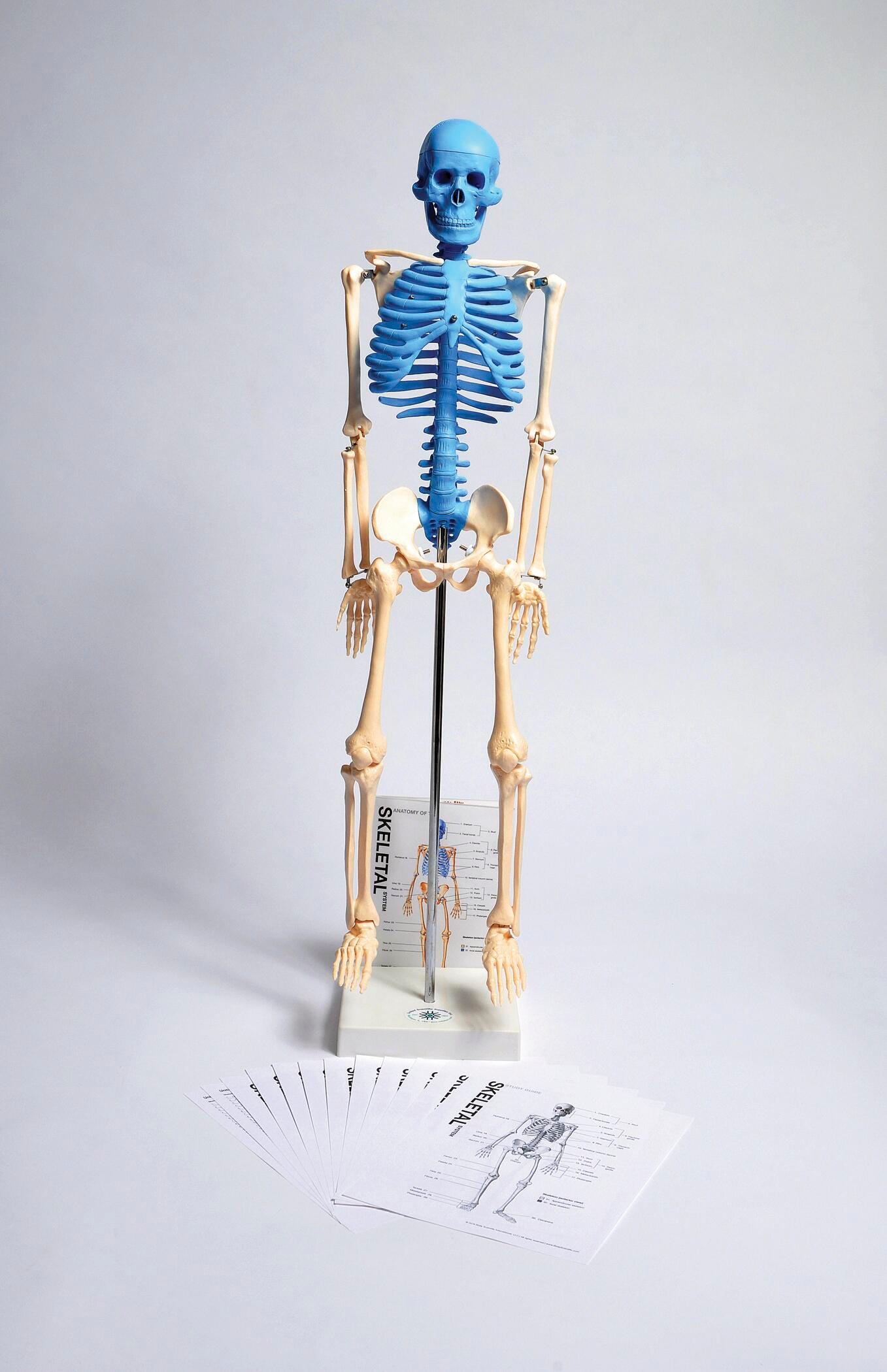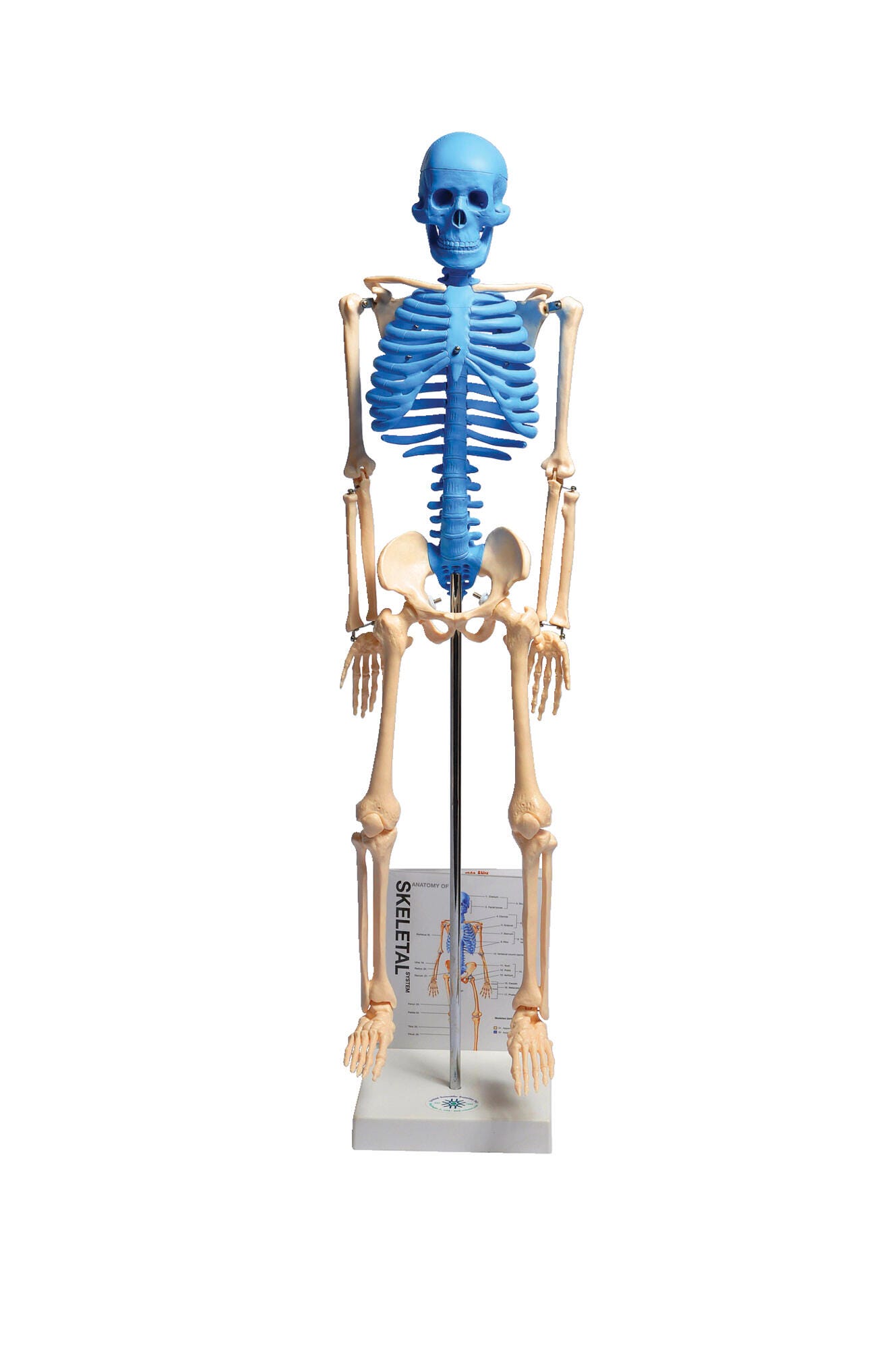 Skeleton model is molded from PVC plastic and hand-painted to show structures of the axial skeleton. Skeleton measures 8 x 5 x 32 inches and mounts on a metal rod with a plastic stand. Includes a fold-out laminated color guide indicating 143 labeled structures including anterior/posterior views of the skeleton and detail of spine, pelvis, vertebra, joint, rib cage, hand and foot. One side of the guide includes structure names. The other side includes only numbers so it can be used for student assessment. Foldout guide rests in a slot molded into the plastic base. Also includes a 12-page reproducible study guide.