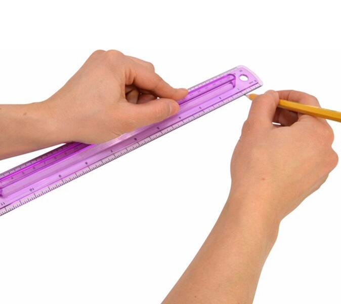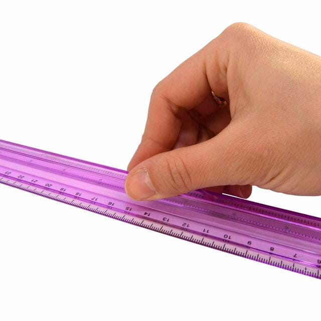 Westcott Finger Grip 12 inch Ruler has beveled edges calibrated in inches on one side and metric on the other. Raised center offers easy grip for small children or those with disabilities. Assorted colors include blue, green, red, purple and colors may vary.Features