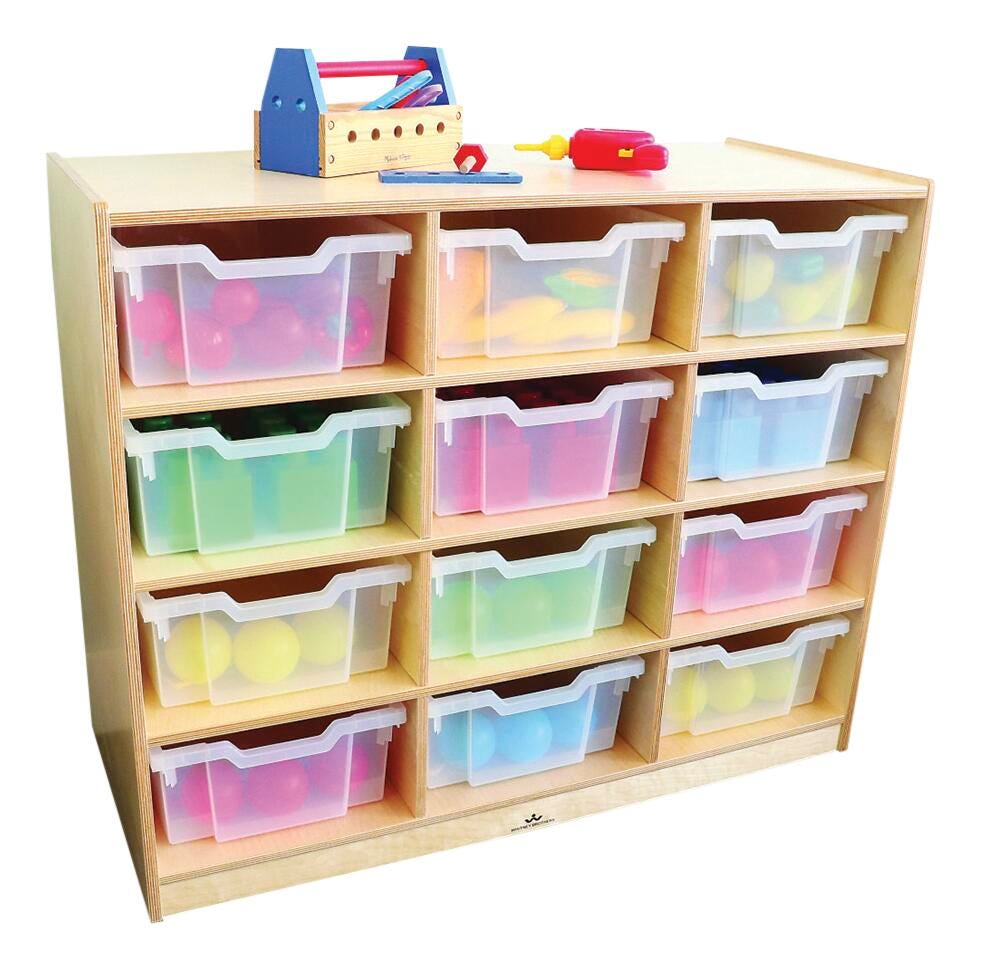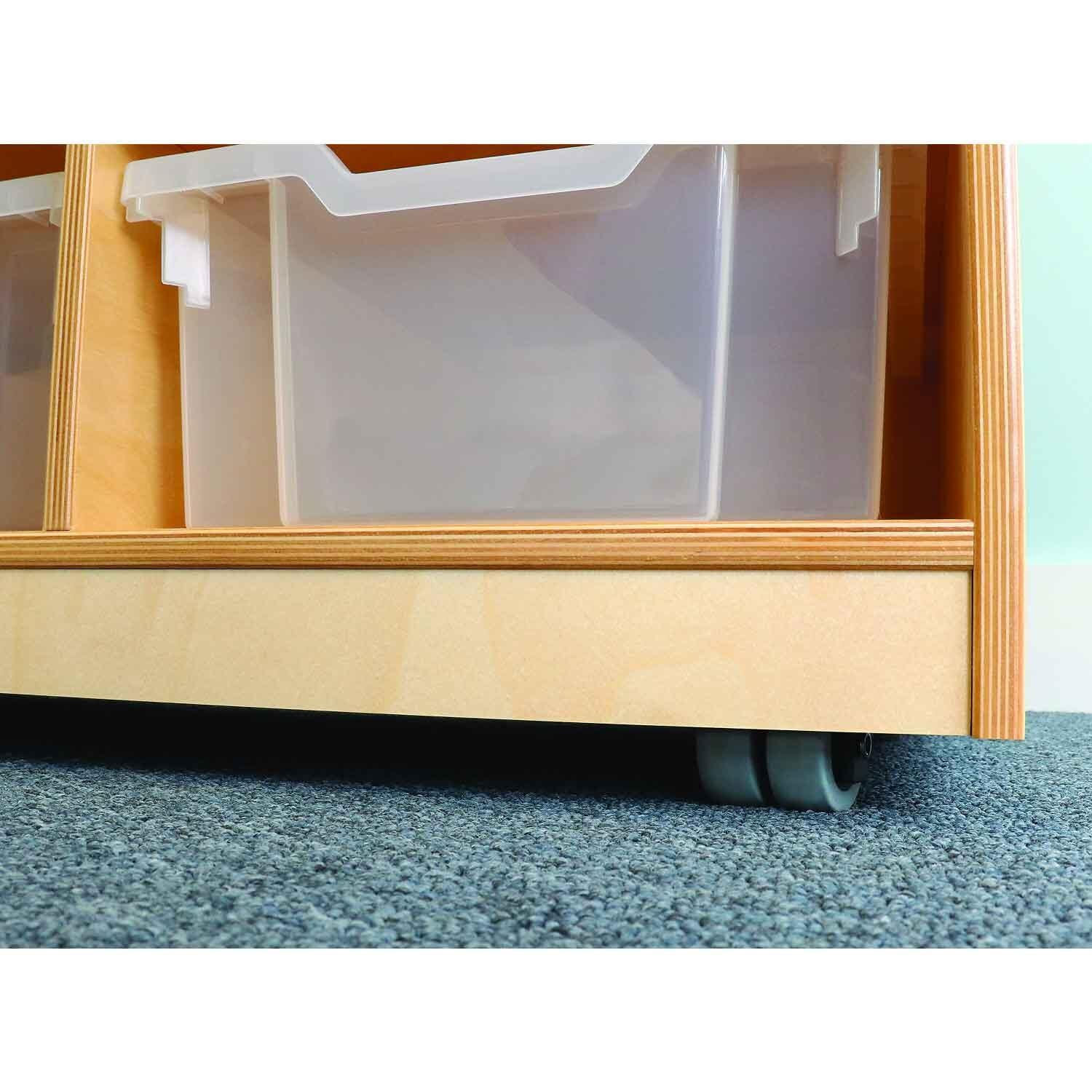 This mobile storage cabinet features nine spacious cubby storage compartments with nine included clear storage bins to make storage, organization and identification of items a snap. The rugged trays can be easily removed and replaced by children after playtime or classroom use. Mounted on heavy duty non-marking casters for convenient mobility.