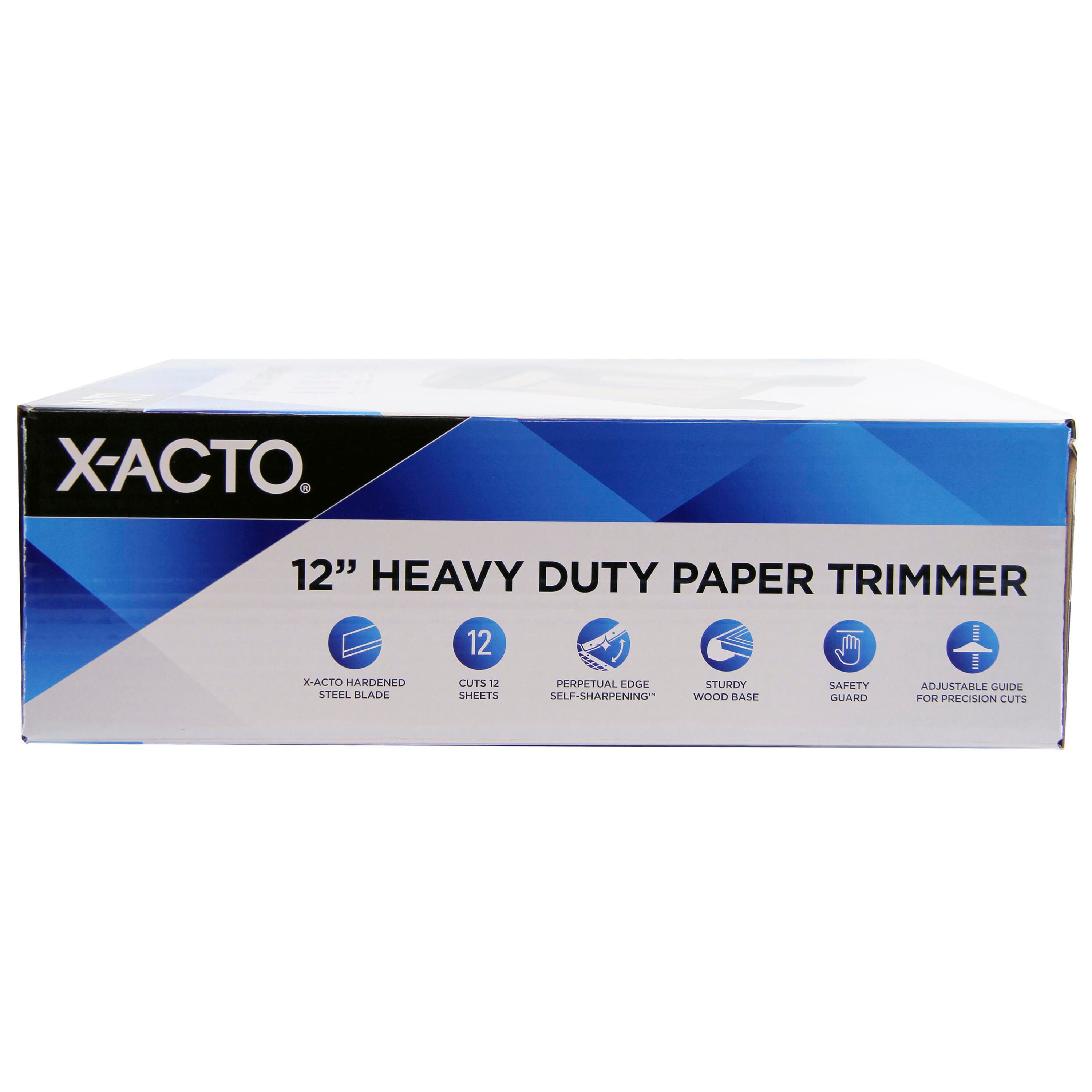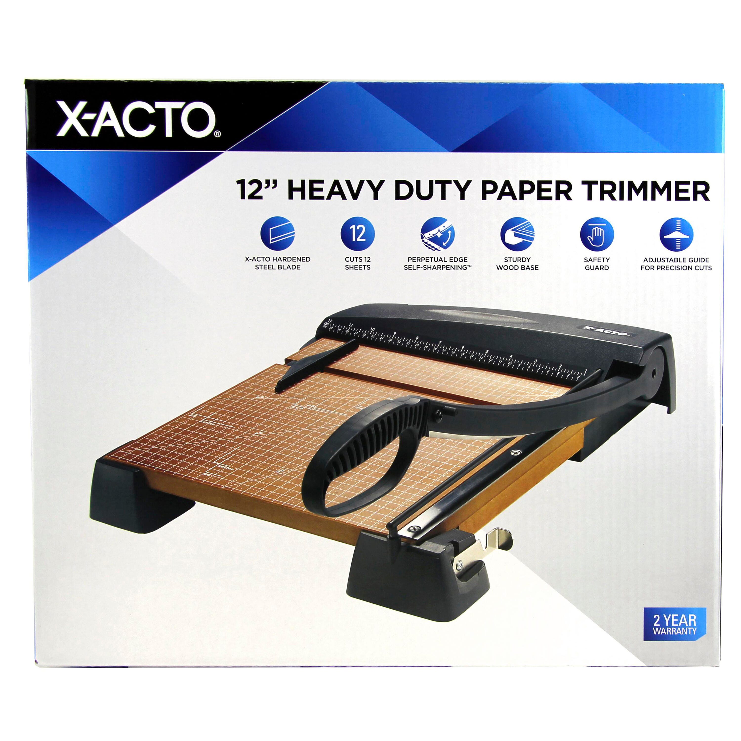 This Heavy Duty Paper Trimmer from X-ACTO features a self-sharpening, fully hardened steel blade to easily and cleanly cut paper, film, and even textiles. It has an easy-grip handle and permanent inch and metric scales to offer precise measurements. The trimmer also features an adjustable sliding paper guide that locks in position for ideal paper alignment and a safety lock that secures the blade when not in use. The wood base has rubber feet to help keep the trimmer in place. Measures 12 x 12 inches.Features