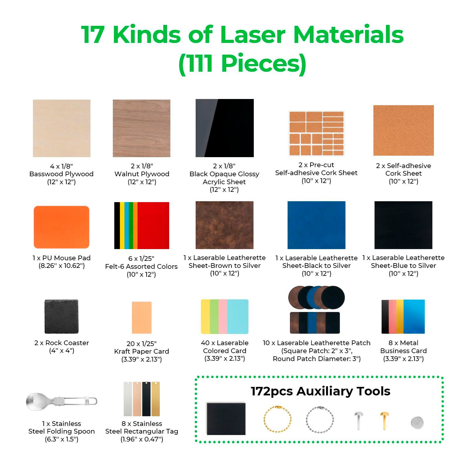 This Laser Material Explore Kit by xTool is a must-have material pack with 17 popular materials, 111pcs laser material, and 172pcs of auxiliary tools. Store every piece in this kit in the 6 included premium kraft paper boxes which help protect the product and keep materials well-organized.Features